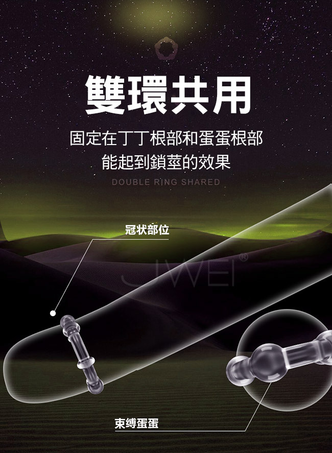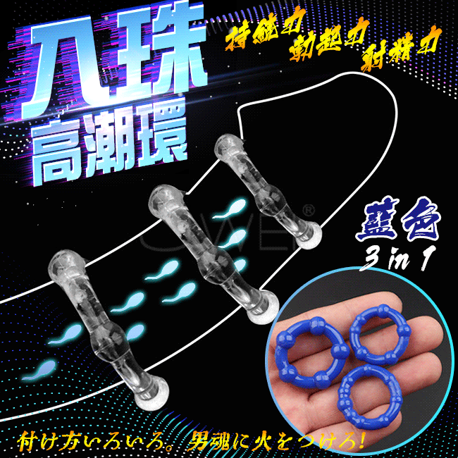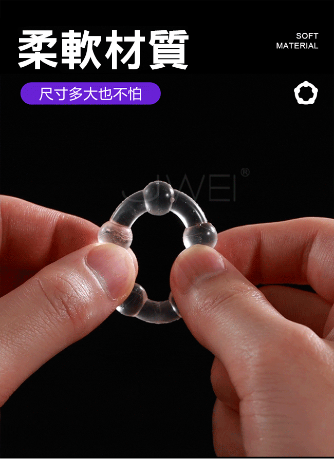 入珠彈韌陰莖加強環,帶球衝擊層層剮蹭,敏感的內壁被瘋狂的觸 擊;三環固定,刺激效果一觸即發;雙環共用,固定在丁丁根部和 蛋蛋根部能起到鎖莖的效果;單環固定,冠狀溝出可固定包皮,增 加龜頭敏感度,防止包皮覆蓋龜頭增加快感;柔軟材質,JJ尺寸多大也不怕!