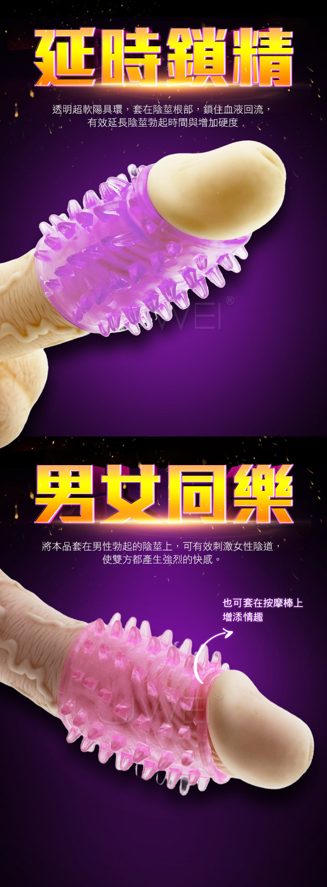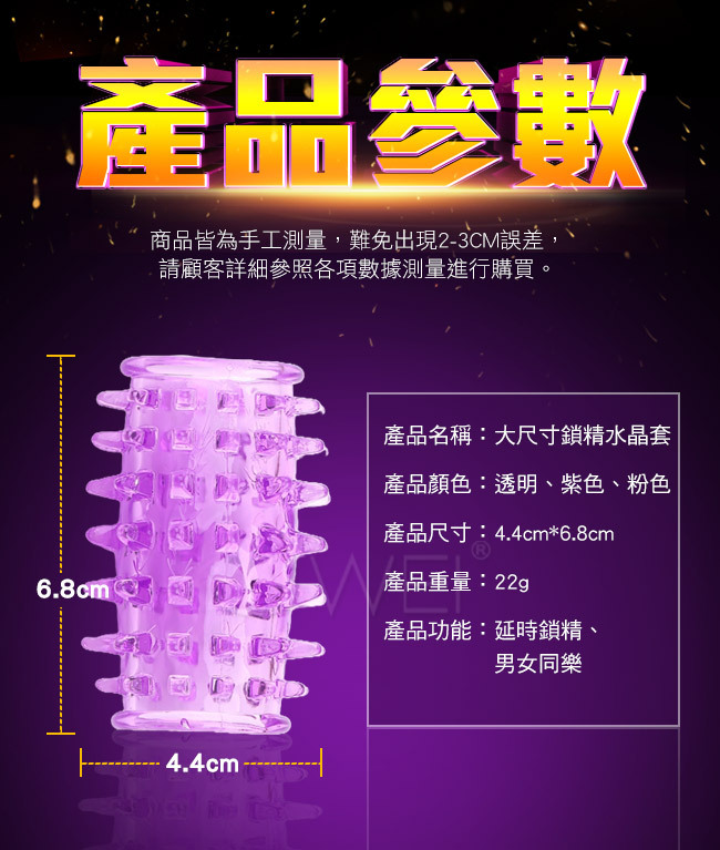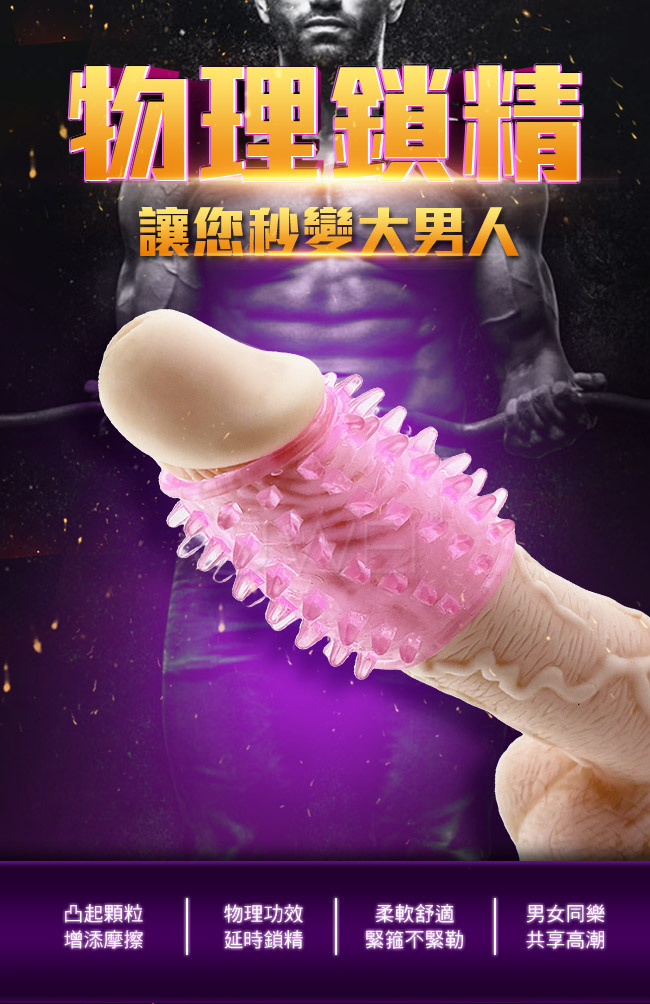 物理鎖精讓您秒變大男人,凸起顆粒,增添摩擦;物理功效延時鎖 精,透明超軟陽具環,套在陰莖根部,鎖住血液回流,有效延長陰 莖勃起時間與增加硬度;男女同樂共享高潮,將本品套在男性勃起 的陰莖上,可有效刺激女性陰道,使雙方都產生強烈的快感;柔軟 舒適 緊箍不緊勒,可任意拉伸,彈性極佳,適合各種陰莖,有了它 以後就不會再草草了事囉~