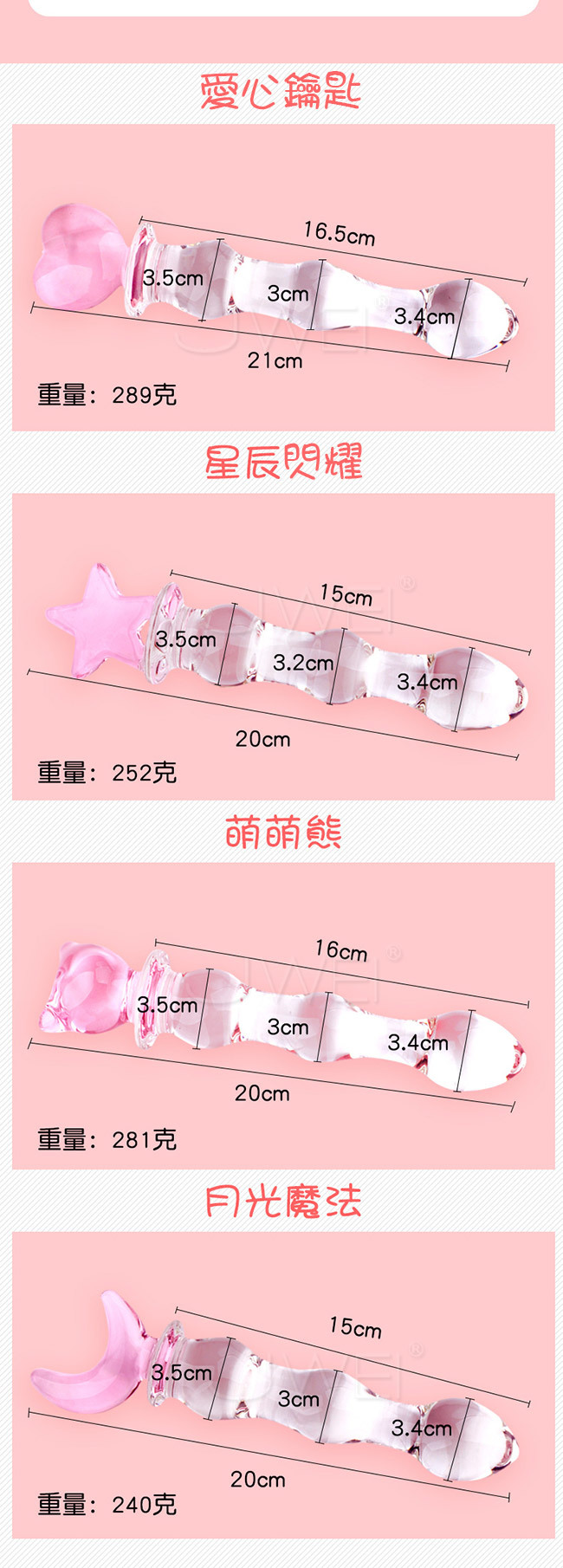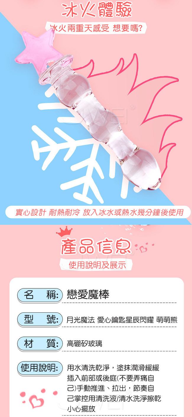 以隱密地整天戴著它,讓你貪婪地享受深入與擴張的快感,完美的 曲線保持長時間的舒適,加強你的敏感神經。特殊的握把,在每次 的進出都與生理結構細膩的結合著,加強著身體反應......耀眼光滑 如絲緞,帶著它在炎熱的臥室中玩耍或者出外參加聚會時,都會給 您帶來頑皮的秘密刺激。每一吋的前進,都在引燃身體的慾火;每 一吋的深入,都碰觸柔軟潮濕的地帶。玻璃,您可以輕易地清理、 擦拭與保存。在炎熱的夏季,可以保持冰涼而享受其它材質無法比 擬的清涼舒爽;在冰冷的冬季可以用暖暖包或者熱水加熱而享受更 舒服的溫暖體驗,冰火兩重天感受,想要嗎?