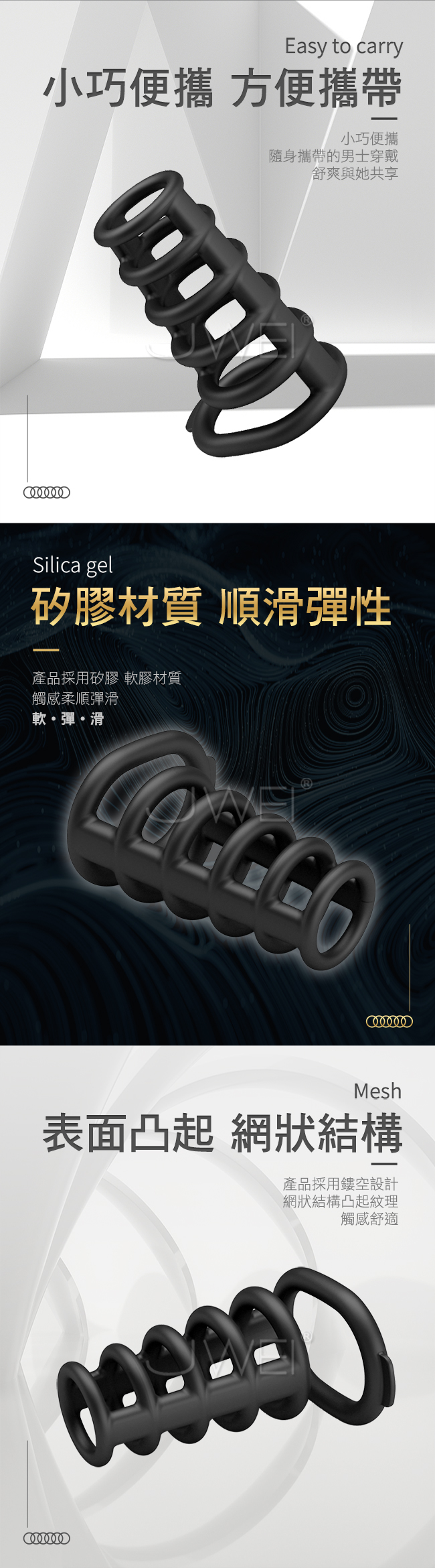 男用連環矽膠套使用時請將產品尾部套環佩戴在指定位置,利用物理助力強力緊鎖擴展運動時長。6重套環摩擦力大採用鏤空設計網狀結構凸起紋理觸感舒適,搭配軟膠材質觸感柔順彈滑。小巧便攜隨身攜帶的男士穿戴讓您輕鬆舒爽與她共享。產品採用生活防水設計清洗更加方便。