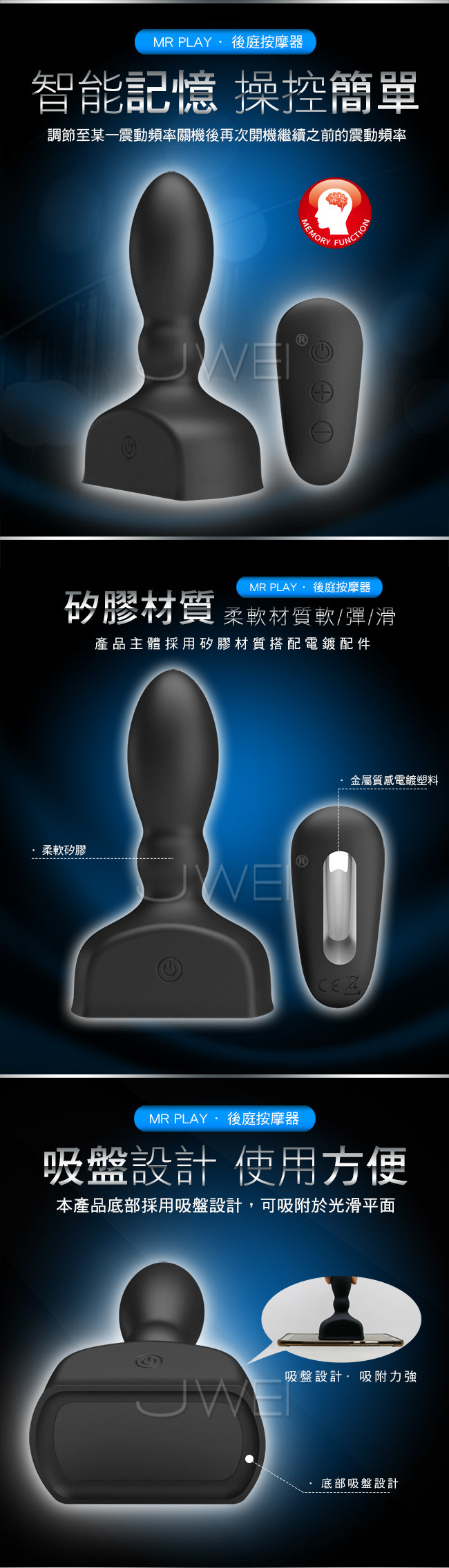 後庭充氣遙控按摩器塞光滑曲線圓潤邊緣,通過膨脹擴張後庭舒適按摩男女皆可使用。能獨立控制也能採無線遙控達到雙重控制效果。擁有12種頻率震動對後庭進行震動按摩,刺激您的感官享受。主體和遙控器採用矽膠材質舒適柔軟,不傷害嬌嫩肌膚。擁有智能記憶操控簡單能繼續上一次的快感體驗。本產品底部採用吸盤設計,可吸附於光滑平面想在哪愛就在哪愛~