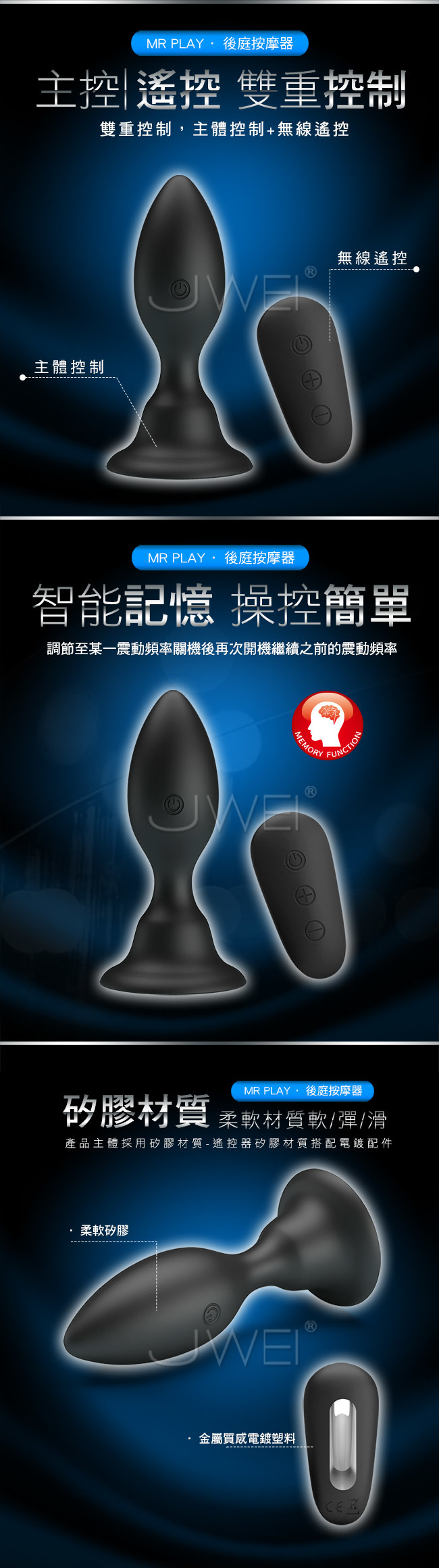 無線遙控後庭按摩器光滑曲線圓潤邊緣,舒適按摩男女皆可使用。能獨立控制也能採無線遙控達到雙重控制效果。擁有12頻震動x5檔震力對後庭進行震動按摩,刺激您的感官享受。主體和遙控器採用矽膠材質舒適柔軟,不傷害嬌嫩肌膚。擁有智能記憶操控簡單能繼續上一次的快感體驗。本產品底部採用吸盤設計,可吸附於光滑平面想在哪愛就在哪愛~