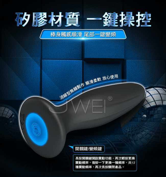 震動後庭塞光滑曲線圓潤邊緣,舒適按摩男女皆可使用。擁有12頻震動對後庭進行震動按摩,刺激您的感官享受暢享舒適。採用矽膠材質舒適柔軟,不傷害嬌嫩肌膚。擁有智能記憶操控簡單能繼續上一次的快感體驗。