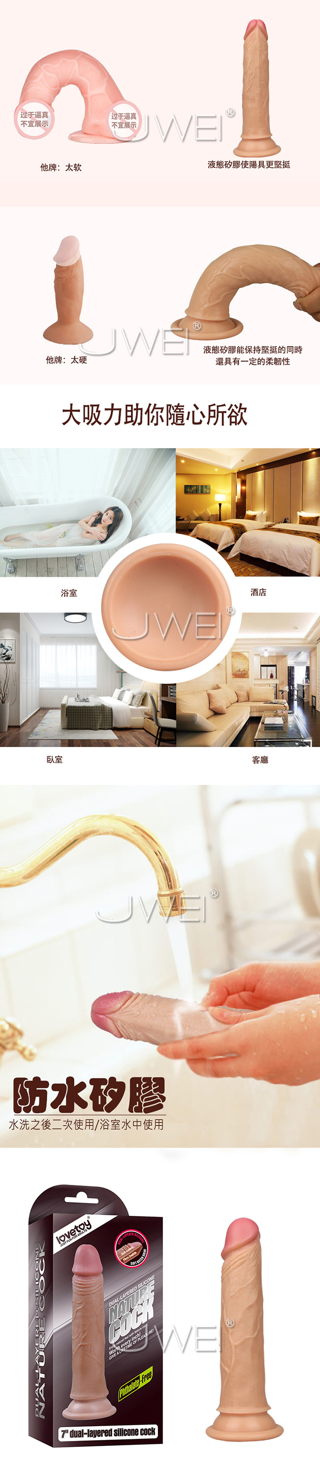 lovetoy推出的nature cock系列極緻逼真按摩棒,以真人老二倒模打造,細膩的完整重現真人老二的肌膚、爆筋血管都猶如真實的陰莖,採用雙層液態矽膠,是東方女性接受度最高的硬度,,底部還設計有吸盤底座,可吸於牆上、床上,任何的光滑表面,多種玩法任你玩,讓你性愛過程更有樂趣喔~