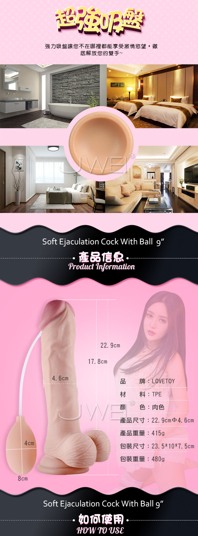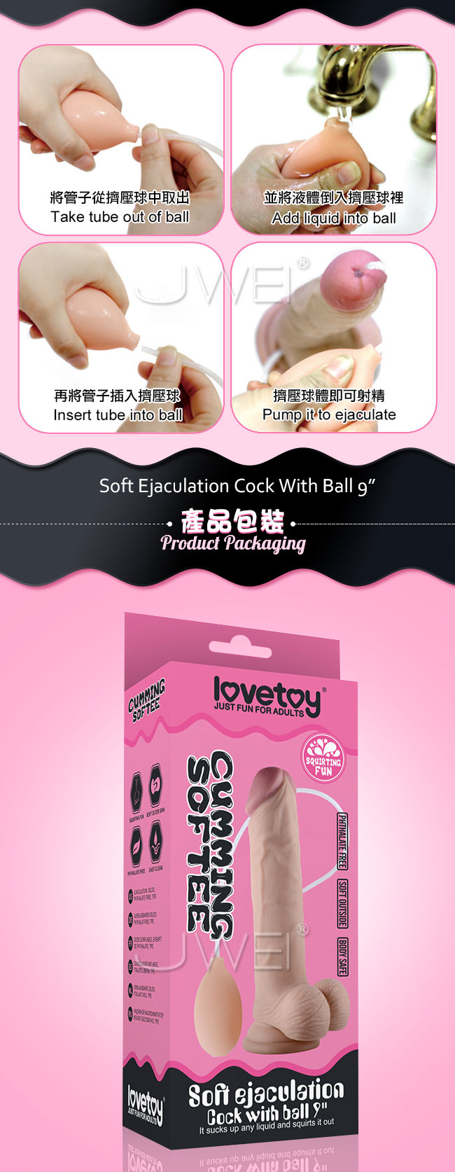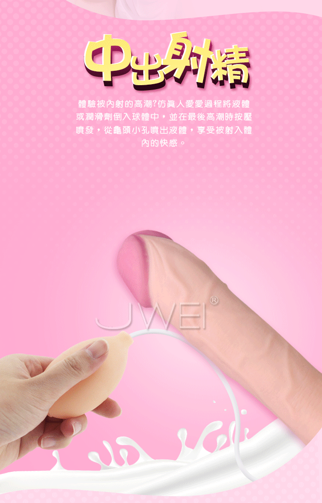 超級逼真青筋紋路,仿真的龜頭設計,插入感彷彿跟真人無異讓您愛不釋手!採用無味,柔軟安全的TPE材料製作,彈性極佳讓您盡情享受在愛的浪潮裡~體驗被內射的高潮感,仿真人愛愛過程將液體或潤滑劑倒入球體中,並在最後高潮時按壓噴發,從龜頭小孔噴出液體,享受被射入體內的快感。強力吸盤讓您不在哪裡都能享受激情慾望,徹底解放您的雙手~