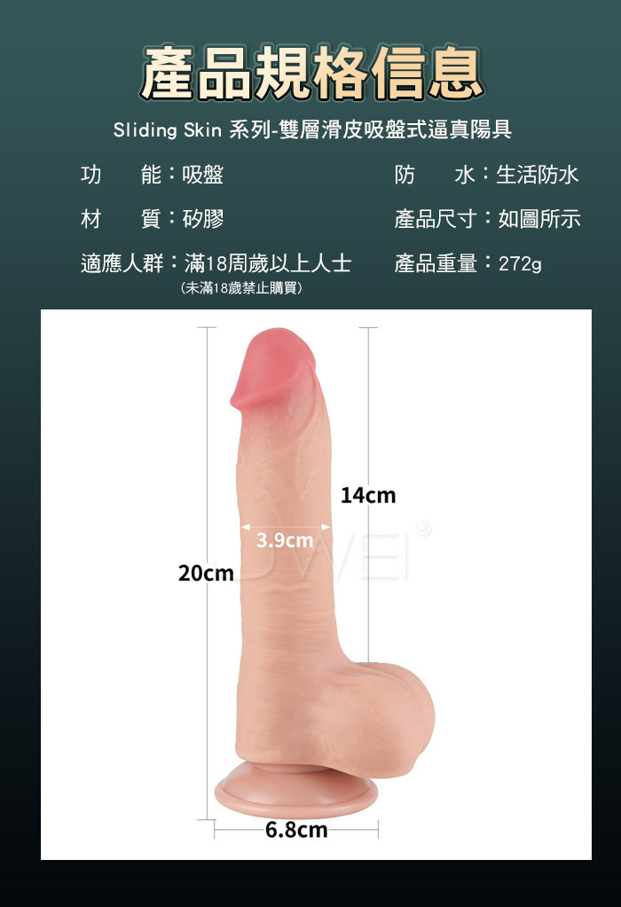 Sliding Skin 系列是精心製作雙層矽膠,採用逼真的雙層滑皮材質製成,手感逼真,採用特殊的雙密度技術模擬勃起陰莖的感覺,這款假陽具具有柔軟的外層皮膚和令人滿意的堅挺內部。 這款逼真的部件採用手工製作,確保真實性,可以輕鬆彎曲成任何形狀,甚至比真實的部件還要好。只需在真實的軸上添加一些水性潤滑油即可增強您的遊戲體驗。 我們的專利吸盤由高強度 TPE 製成,可以擰上或擰下,方便使用。它還提供強大的吸力,讓您盡情玩耍。