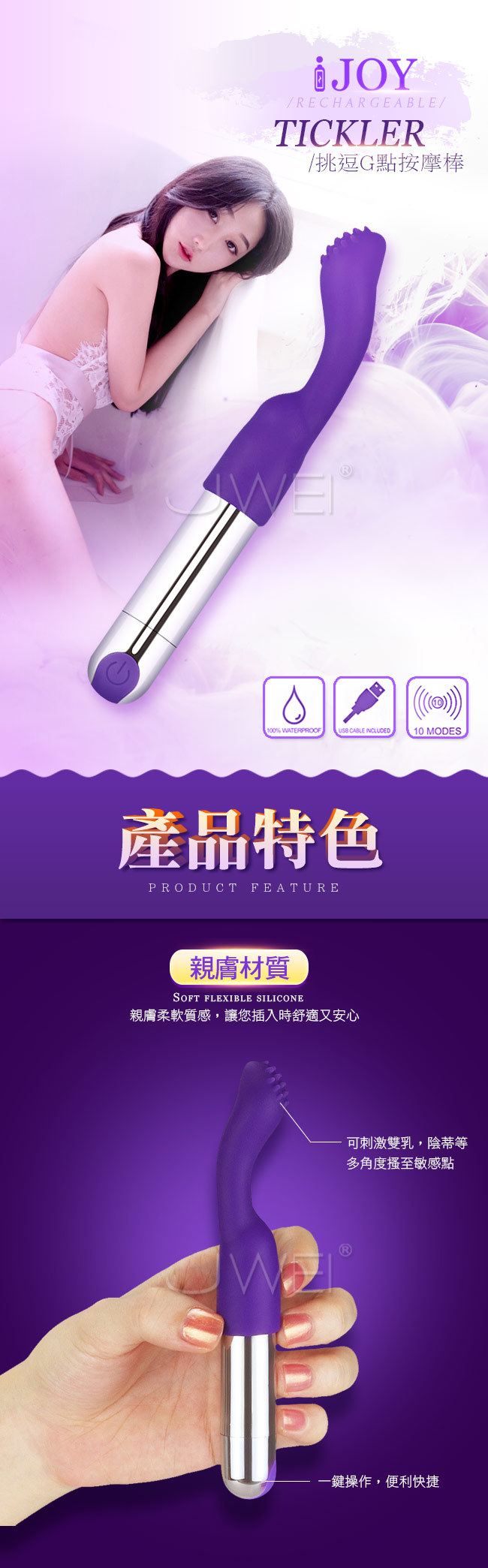 i Joy Tickler G點按摩棒擁有柔軟親膚材質製成,插入時舒適不傷肌,且採多功能觸點設計可多角度按摩陰蒂、雙乳、摩擦G點,使快感層層堆疊,達到極致高潮使愛如潮水般一發不可收拾喔~而10段變頻模式搭配一鍵操控,用最簡單的方式輕鬆達到多種快感體驗。採USB充電模式讓您一次愛個夠不怕中途沒電~並且擁有防水設計讓您盡情享受魚水之歡更方便清洗喔~