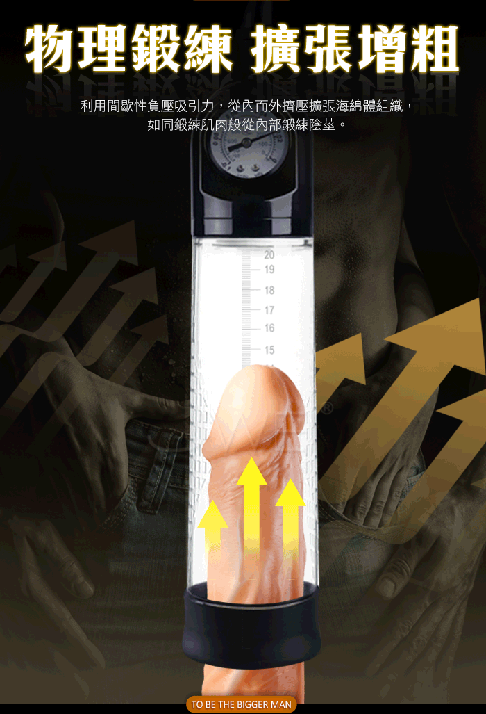 氣囊式吸引透過反覆按壓氣囊通過泵產生氣壓,刺激著陰莖海綿體,使陰莖反 覆充血、擴張而達到助勃增大的目的。利用間歇性負壓吸引力,從內而外擠壓 擴張海綿體組織,如同鍛練肌肉般從內部鍛練陰莖反覆吸洩讓男根增大。附刻 度表直觀感受,讓您感受到成長的變化。