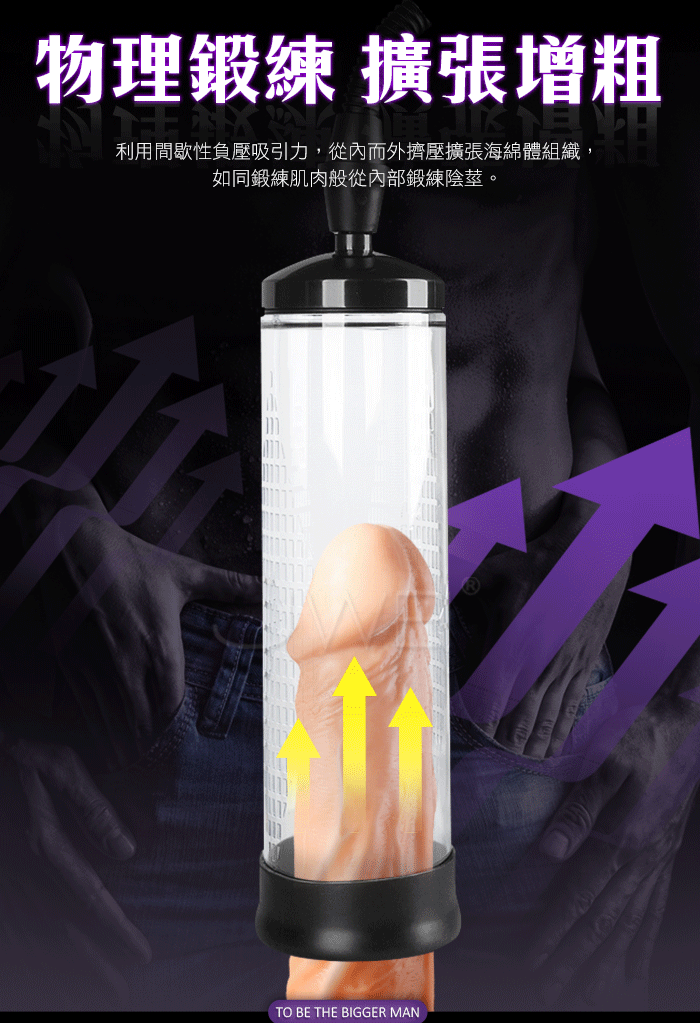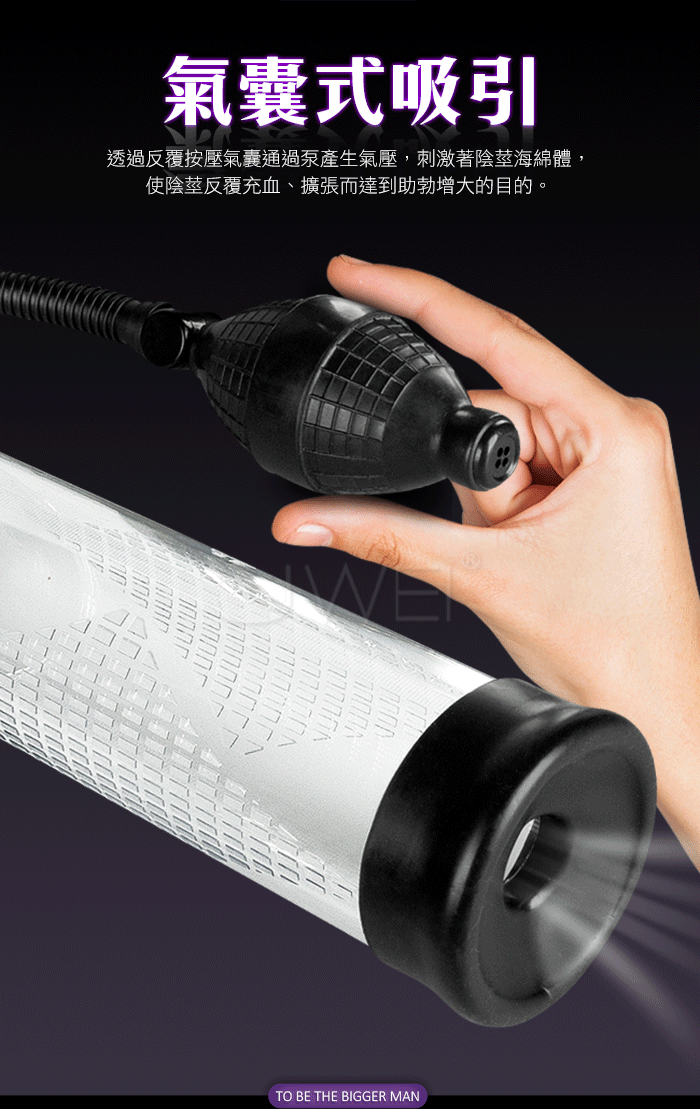 氣囊式吸引透過反覆按壓氣囊通過泵產生氣壓,刺激著陰莖海綿體,使陰莖反 覆充血、擴張而達到助勃增大的目的。利用間歇性負壓吸引力,從內而外擠壓 擴張海綿體組織,如同鍛練肌肉般從內部鍛練陰莖反覆吸洩讓男根增大。附刻 度表直觀感受,讓您感受到成長的變化。