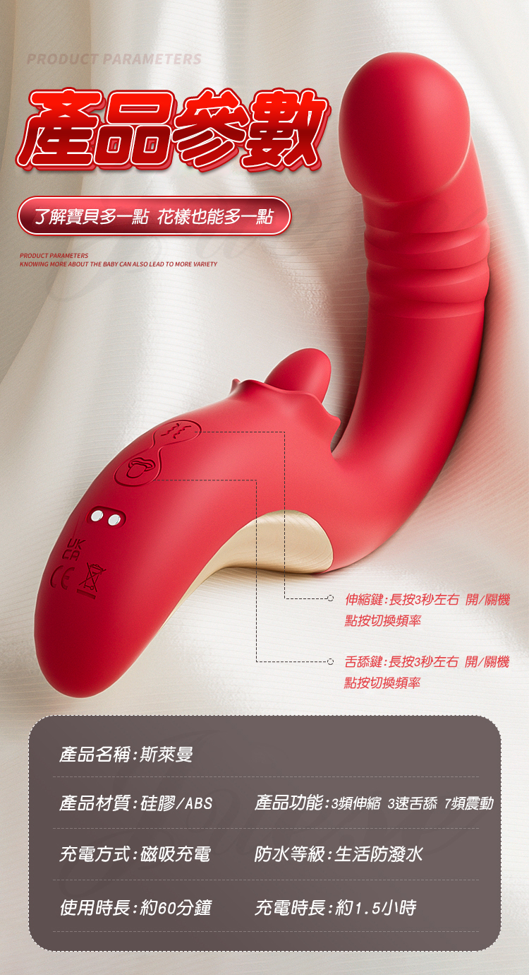 斯萊曼 3頻伸縮舌舔+7段震動軟舌蜜豆USB充電震動按摩棒