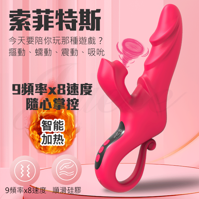 索菲特斯 9段摳動蠕動x8速吮吸點燃蜜豆液顯USB充電式加溫按摩棒-紅色