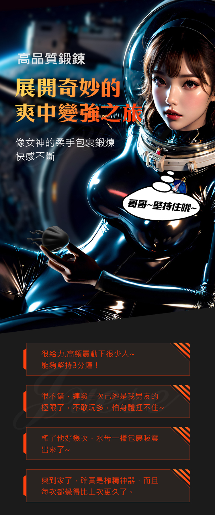 展開奇妙的爽中變強之旅,像女神的柔手包裹鍛煉快感不斷。不管是自慰還是訓練都能滿足,套上感受不同頻率的按摩吧~