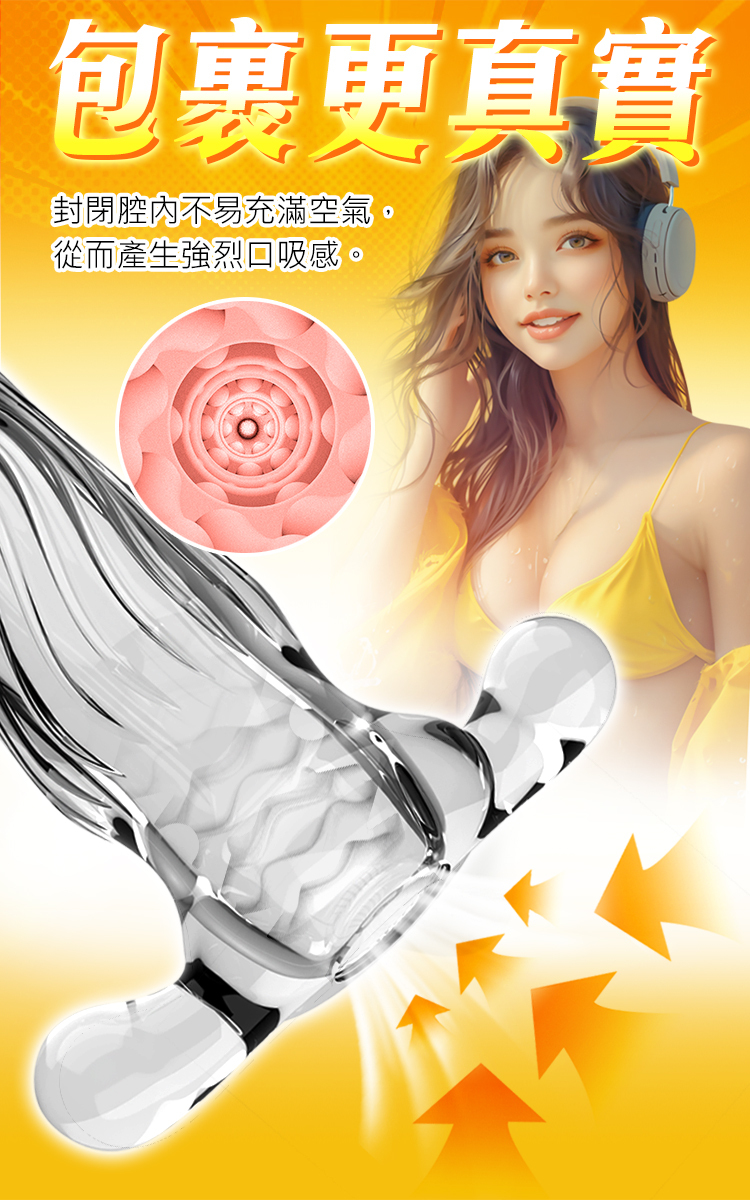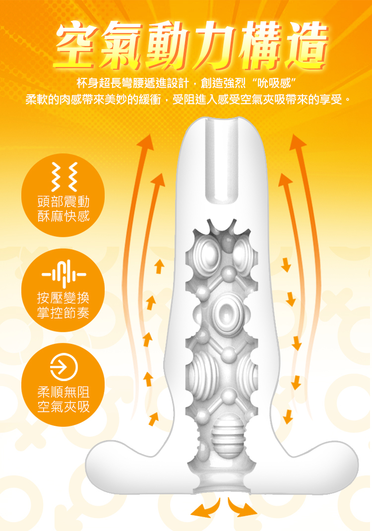 空氣動力構造,杯身超長彎腰遞進設計,創造強烈“吮吸感”,柔軟的肉感帶來美妙的緩衝,受阻進入感受空氣夾吸帶來的享受。