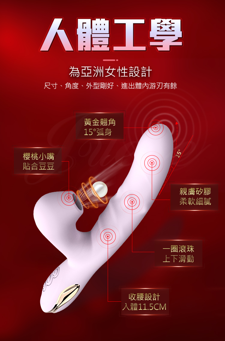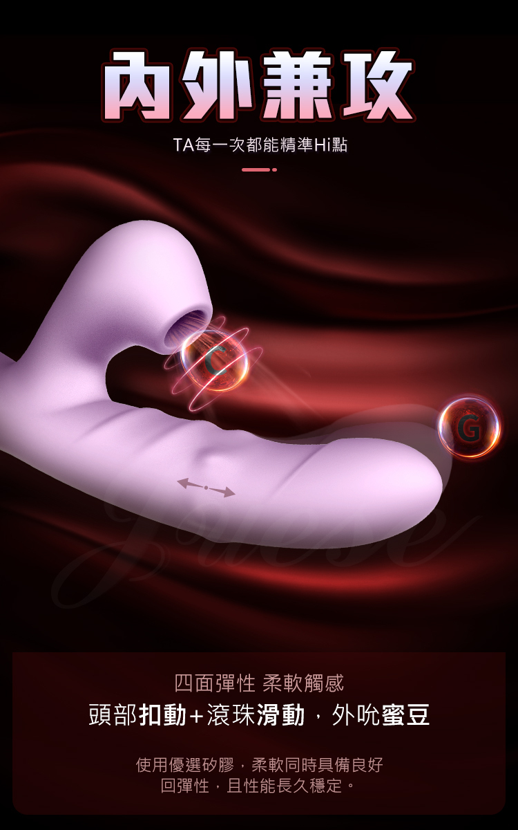 四面彈性 柔軟觸感,頭部扣動+滾珠滑動,外吮蜜豆,使用優選矽膠,柔軟同時具備良好回彈性,且性能長久穩定。