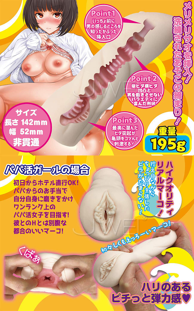 スマッシュヒットを記録中の「2.5次元シリーズ」のコンパクトオナホです。 この「パパ活ガール」は、イマドキのパパ活女子のビッチなアソコをリアルに再現したホールで、控えめながらちょっぴり主張したビラビラがそそります。 メリハリのある内部形状は、男性の感じるところを知ったかぶった挿入口から挿入すれば、縦ヒダと横ヒダの凹凸が男性を飽きさせない形状になっています。 そして、最奥部にはヒダ突起が亀頭をコツんと刺激する刺激的な作りです。 また、洗練されたアソコの締まりは格別です。 彼とのHとは別腹な都合のいいマーコも兼ね備えたナマイキムスメに、思いっきり中出ししちゃってください。