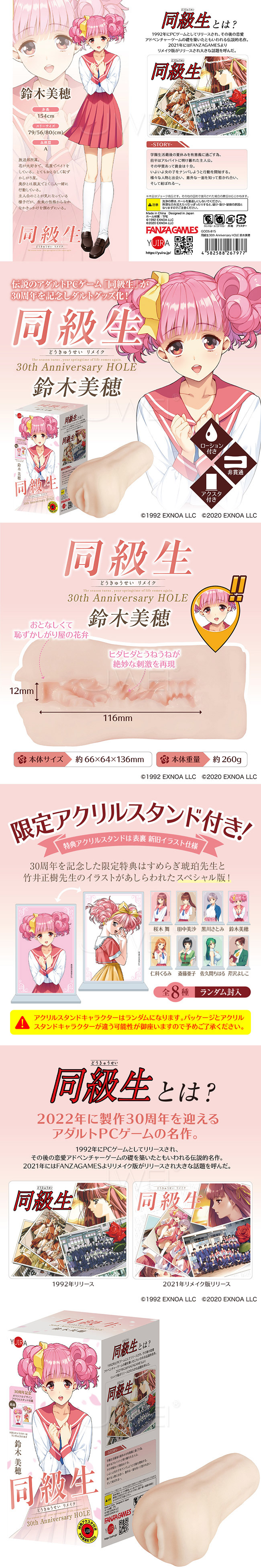 伝説のゲームがいま30年の時を超えアダルトグッズ化!美少女ゲーム界に革命を巻き起こした伝説的作品「同級生」。そんな名作の生誕30周年を記念して作品キャラクターをイメージしたオナホールが登場!再現每個角色內部形象的自慰器