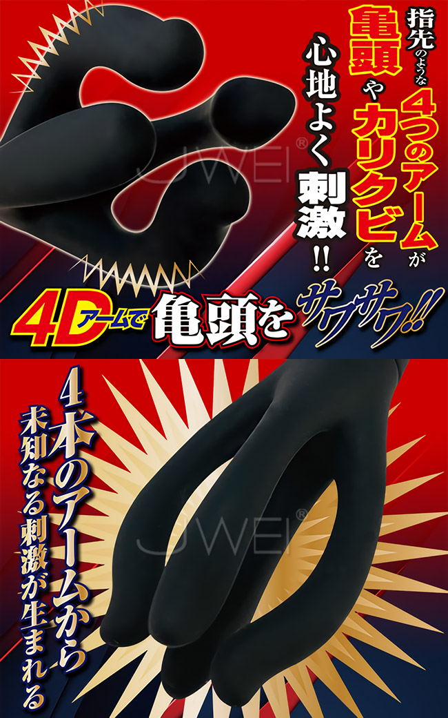 亀頭アームを包みながら刺激する! 新世代の亀頭マッサージャーのご紹介です。 擦ってオナニーする時代から、亀頭だけを振動させて刺激する新時代の到来です。 ヘッド部は、4本のアームで形成されており、まるで4本の指で刺激されているような、さわさわとした心地良さが快感です。 ローターを尿道に押し当てれば、かつてない射精感を味わえます。 未知なる刺激を堪能できる、4本アームの亀頭刺激電動オナホは、7種類の振動パターンの切り替えも搭載されているエロチックなタイプです。
