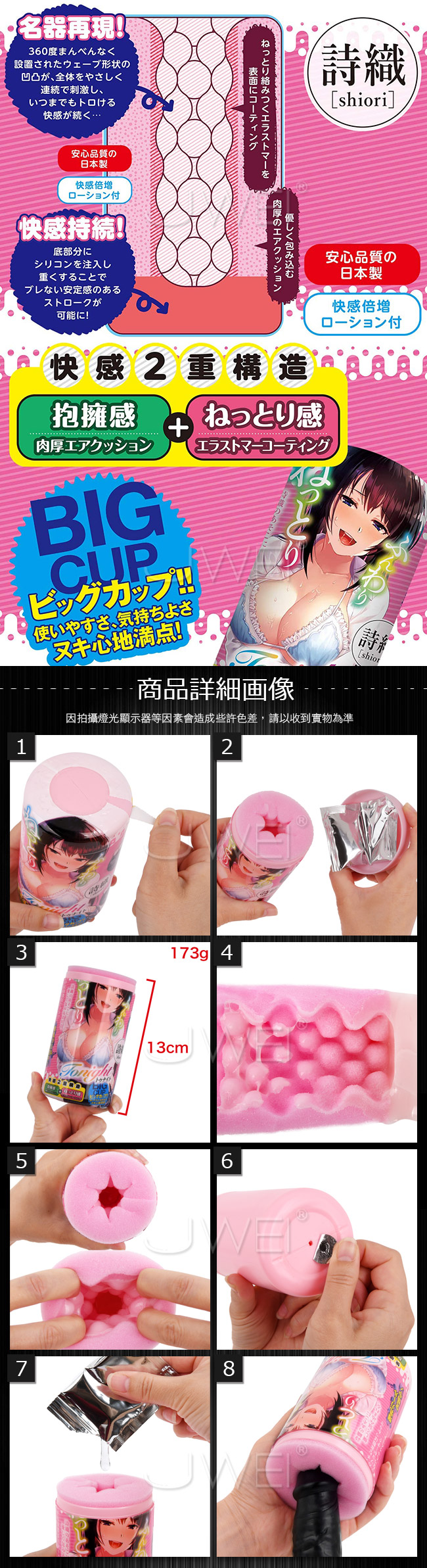 使いやすさ、気持ちよさ、ヌキ心地満点!!ワンコインビッグカップ「トゥナイト 詩織」登場!!肉厚エアクッションとエラストマーの2重構造で、抱擁感+ねっとり感のある名器を再現!!底部には重りが付いているので、ブレない安定感のあるストロークが可能に。発情中の爆乳ガールの名器に優しく包み込まれよう。【内部形状特徴】360度まんべんなく設置されたウェーブ形状の凹凸が、全体を優しく連続刺激。いつまでも蕩ける快感が続く・・・