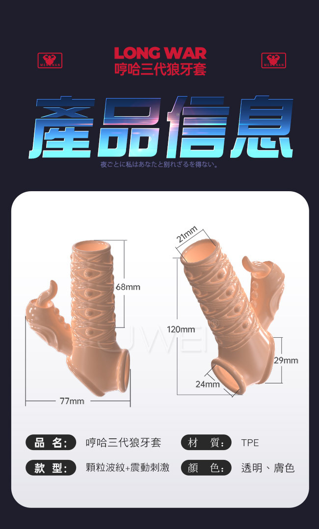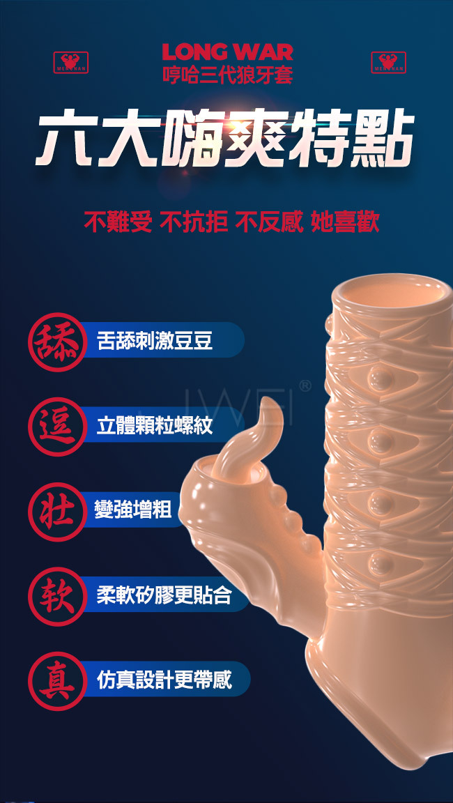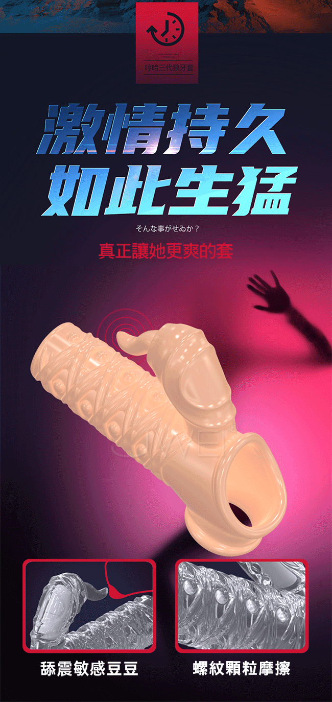 哼哈三代狼牙套,螺紋顆粒摩擦,舔震敏感豆豆,頭部露出設計,保留龜頭爽感! 柔軟矽膠更貼合,仿真設計更帶感,彈性好、質量穩,自然舒適,震觸蜜豆,彈性好,直徑再粗都能用。