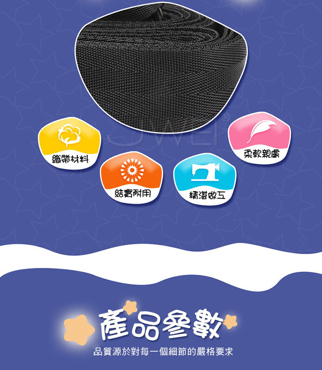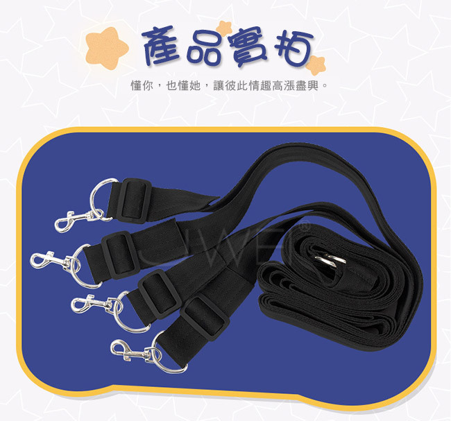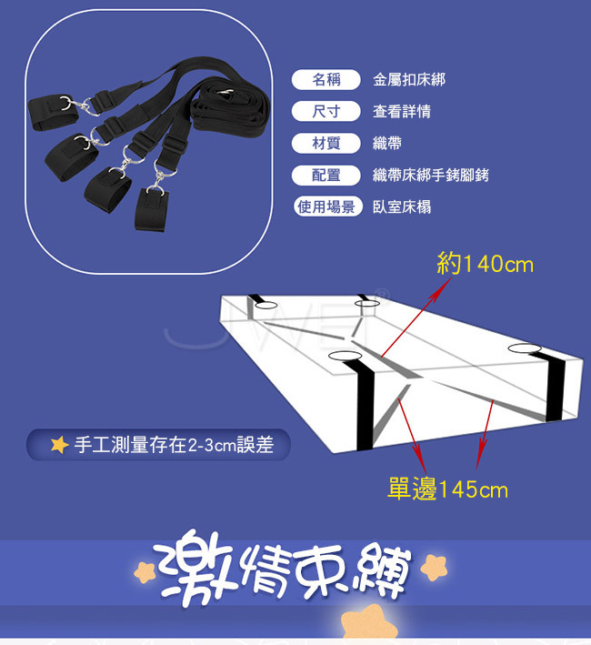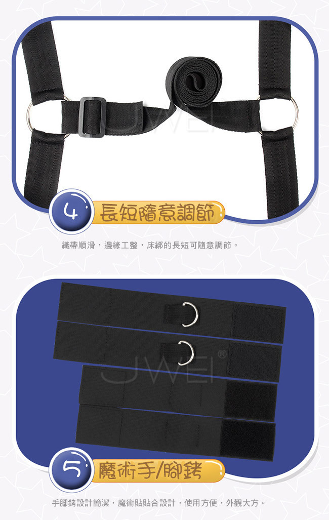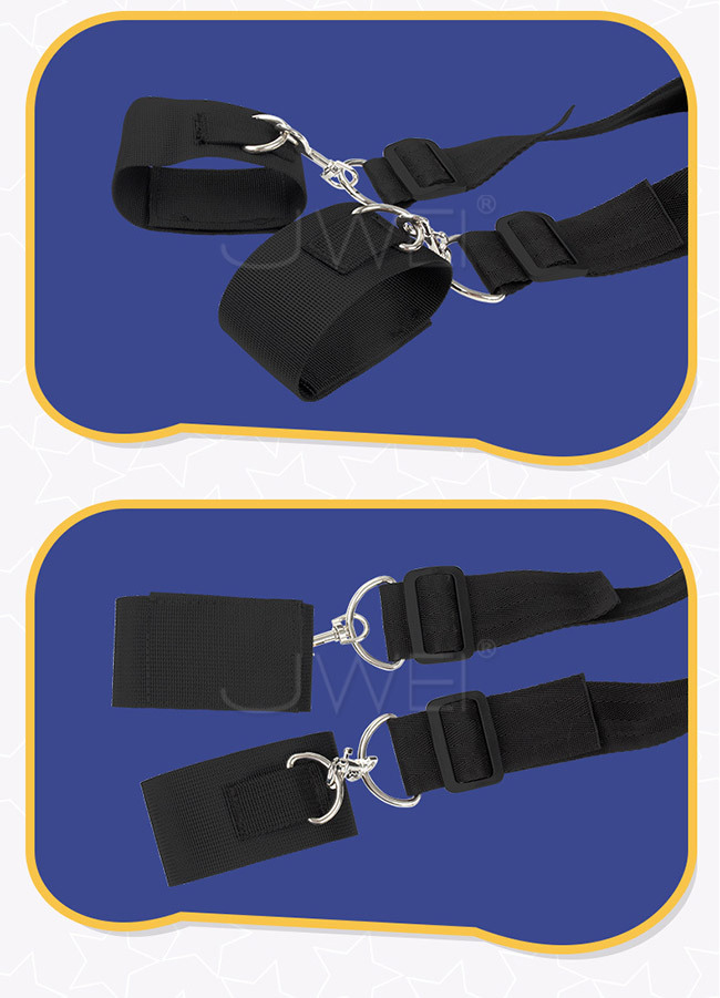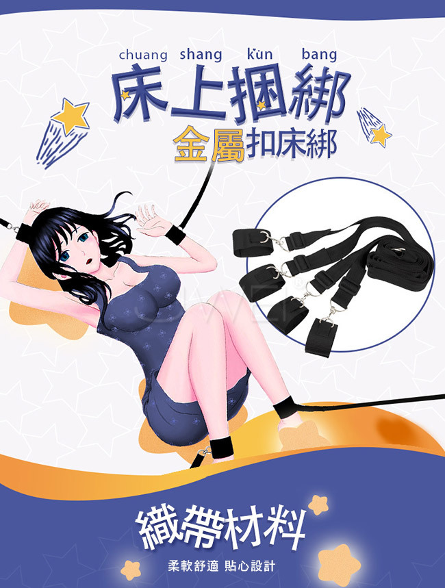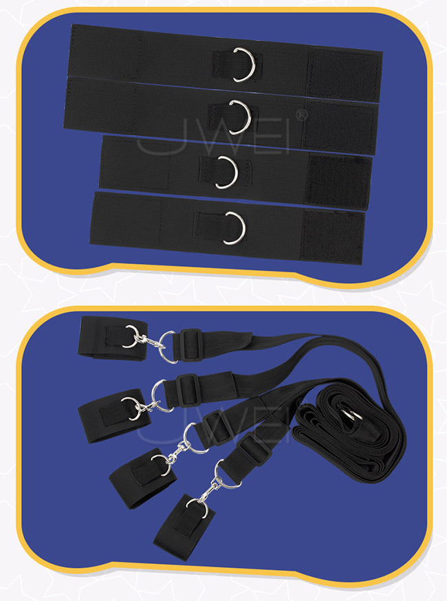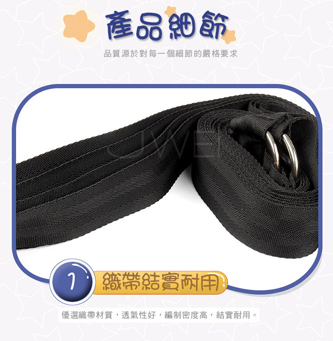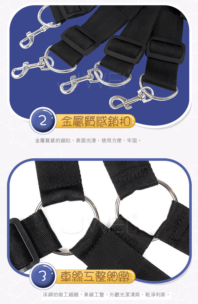 優選織帶材質,透氣性好,編制密度高,結實耐用。金屬質感的鎖扣,表 面光滑,使用方便,牢固。床綁的做工細緻,車線工整,外觀光潔清爽, 乾淨利索。織帶順滑,邊緣工整,床綁的長短可隨意調節。手腳銬設計簡 潔,魔術貼貼合設計,使用方便,外觀大方。