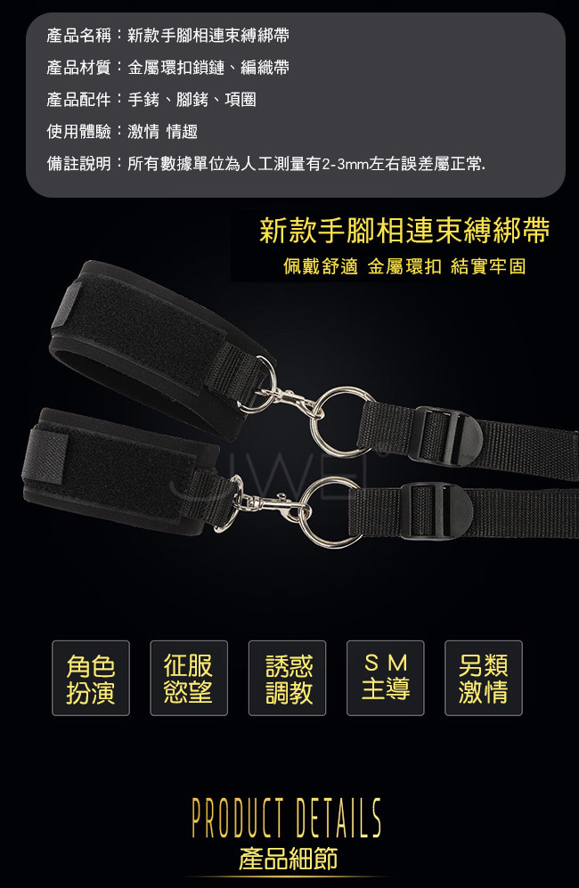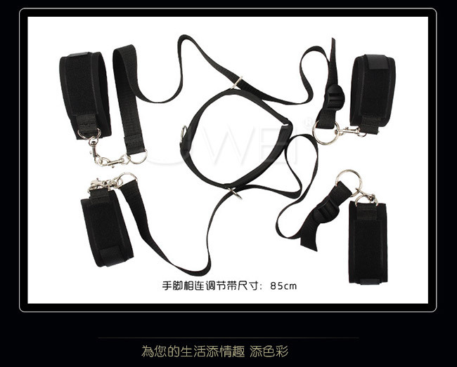 新款手腳相連束縛綁帶,佩戴舒適、金屬環扣、結實牢固;手腳銬的調節帶可根據 您的需求,自行調節長短,方便實用;手腳銬以及項圈處都是採用的海綿和織帶材 料,佩戴舒適、手感柔軟。