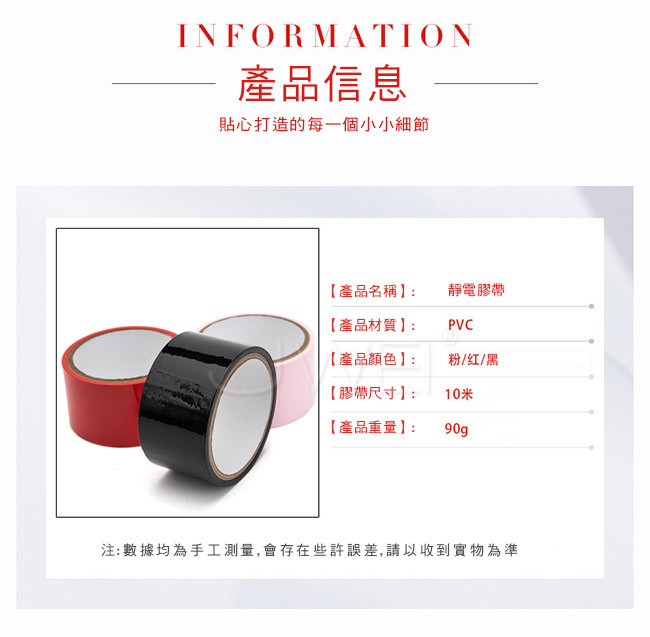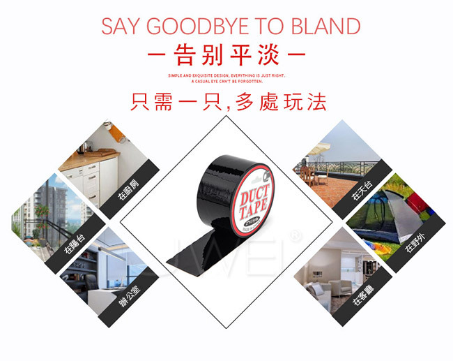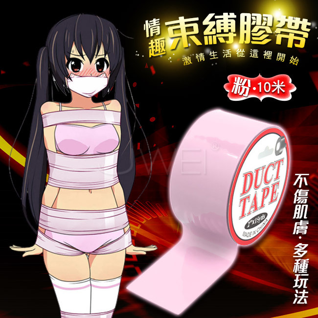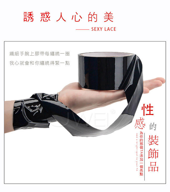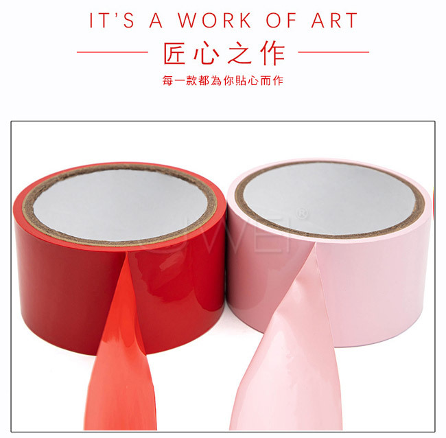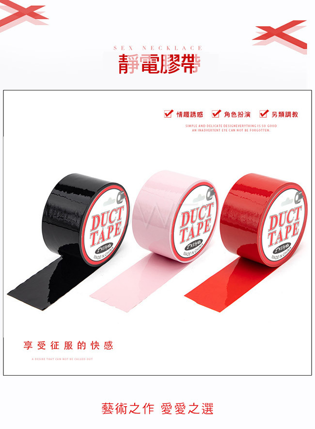 激情生活從這裡開始,封嘴、朦眼、捆綁發揮你的創意;專門為SM遊戲而設計的新型捆綁靜電膠帶,該膠帶為環保材料,採用靜電吸附,不含黏膠,捆綁後膠帶不會黏住人體皮膚,更不會在皮膚上留下殘留物。