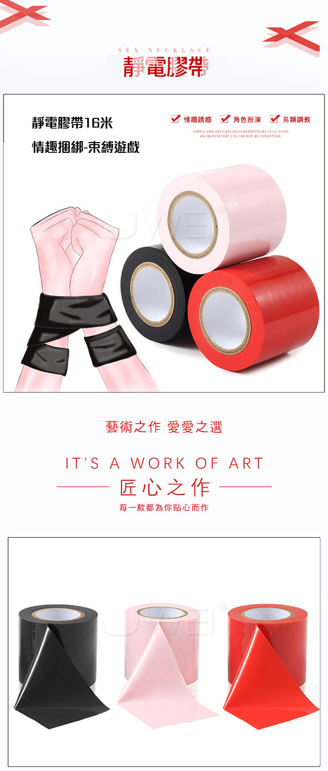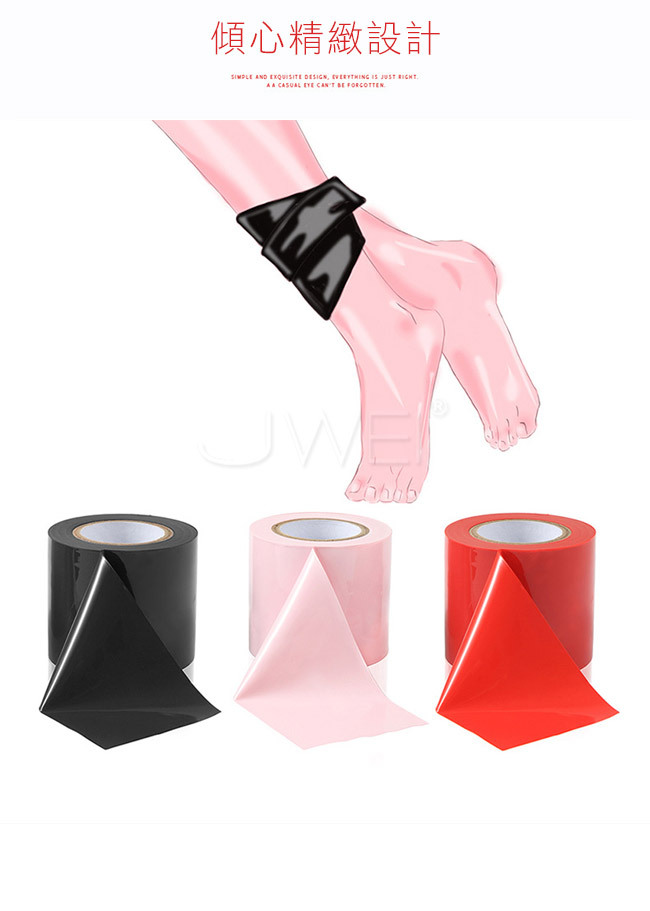 激情生活從這裡開始,封嘴、朦眼、捆綁發揮你的創意;專門為SM遊戲而設計的新型捆綁靜電膠帶,該膠帶為環保材料,採用靜電吸附,不含黏膠,捆綁後膠帶不會黏住人體皮膚,更不會在皮膚上留下殘留物。