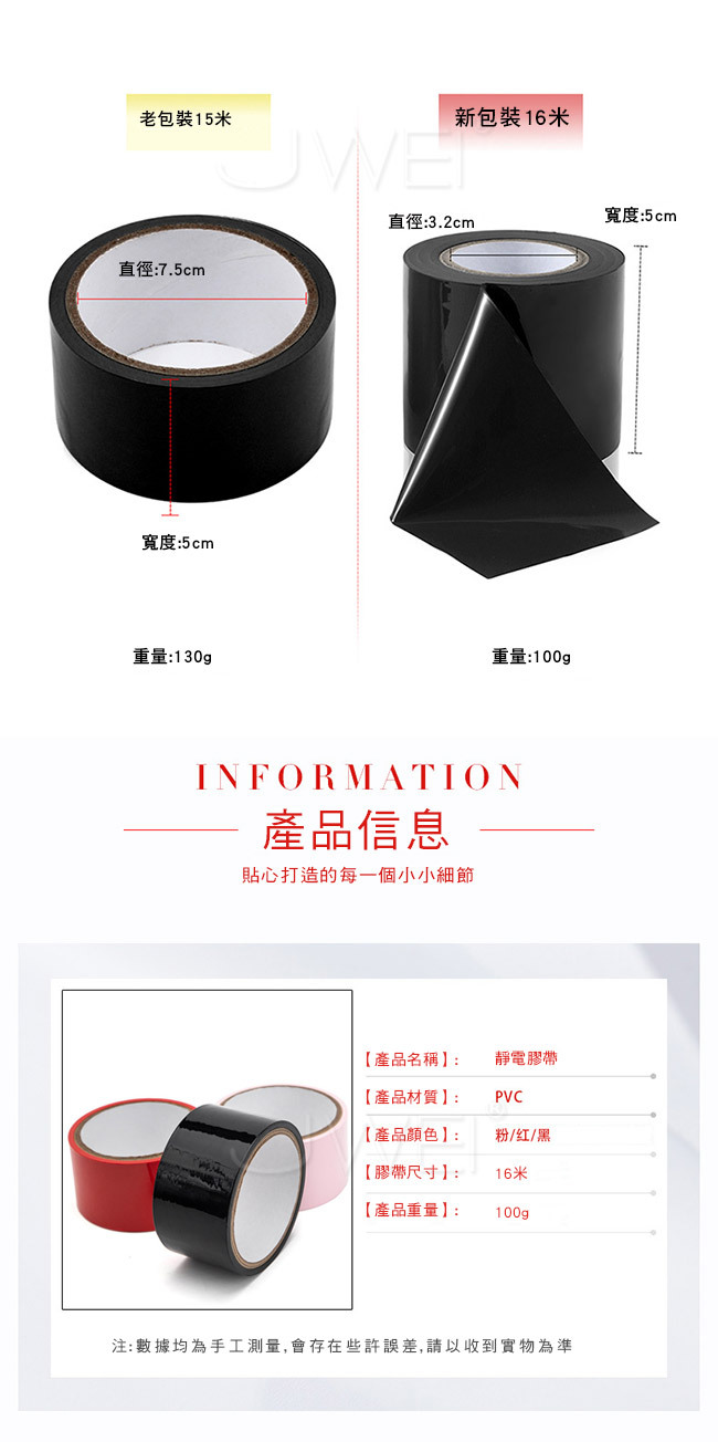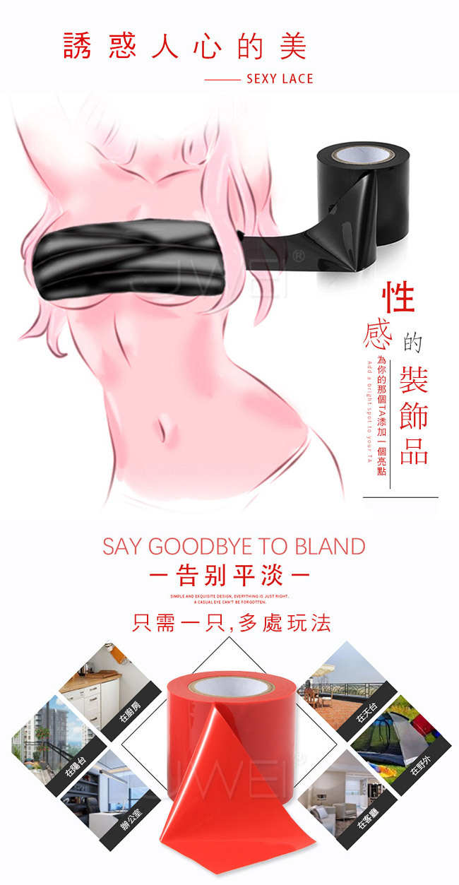 激情生活從這裡開始,封嘴、朦眼、捆綁發揮你的創意;專門為SM遊戲而設計的新型捆綁靜電膠帶,該膠帶為環保材料,採用靜電吸附,不含黏膠,捆綁後膠帶不會黏住人體皮膚,更不會在皮膚上留下殘留物。