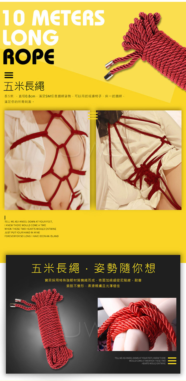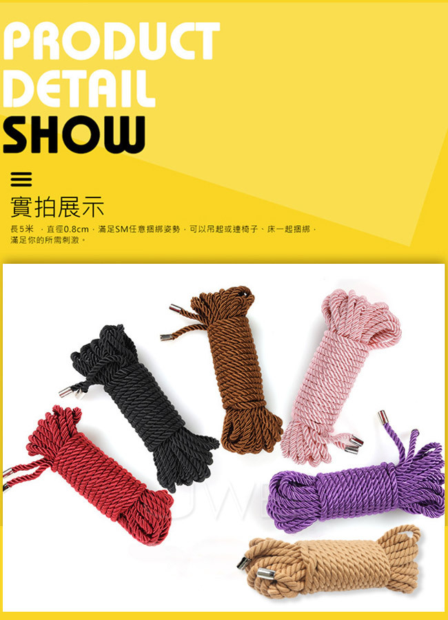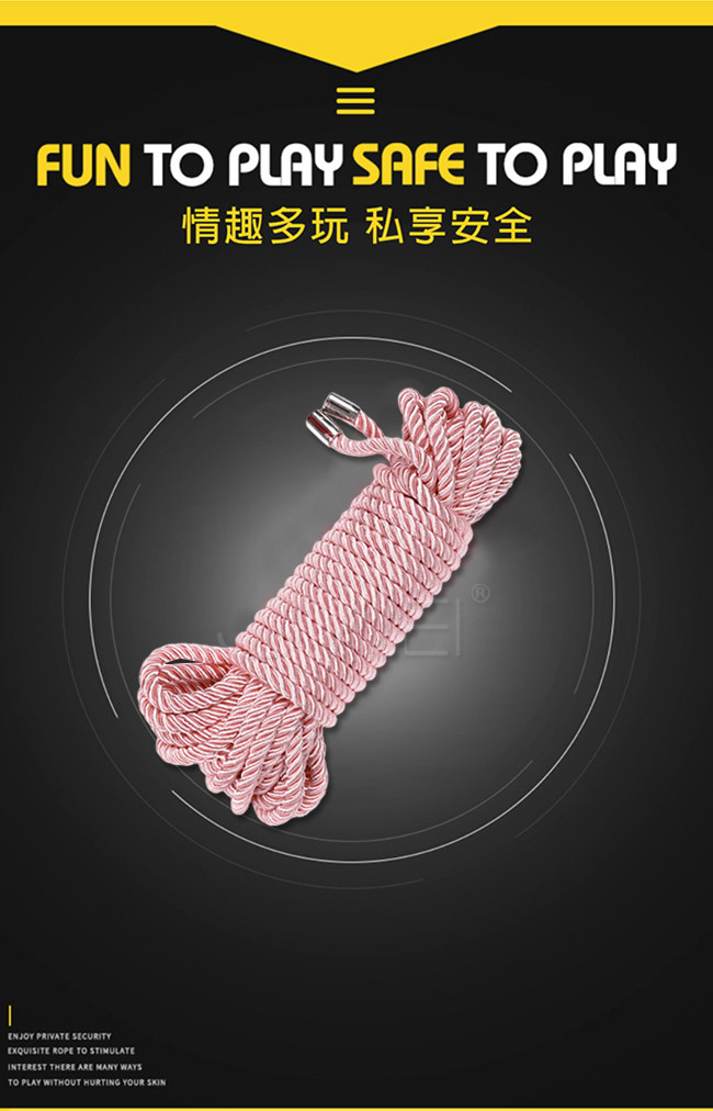 解鎖各種情趣姿勢,情趣多玩,百種姿勢任你擺佈,私享安全;束縛捆綁,細膩親膚,採用特殊強韌材質編織而成,表面加繞細密尼龍線、耐磨索段不變形,柔滑親膚且光澤感極佳!