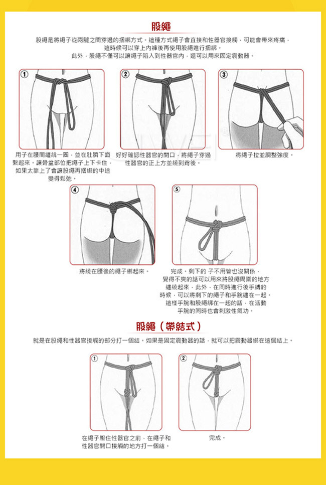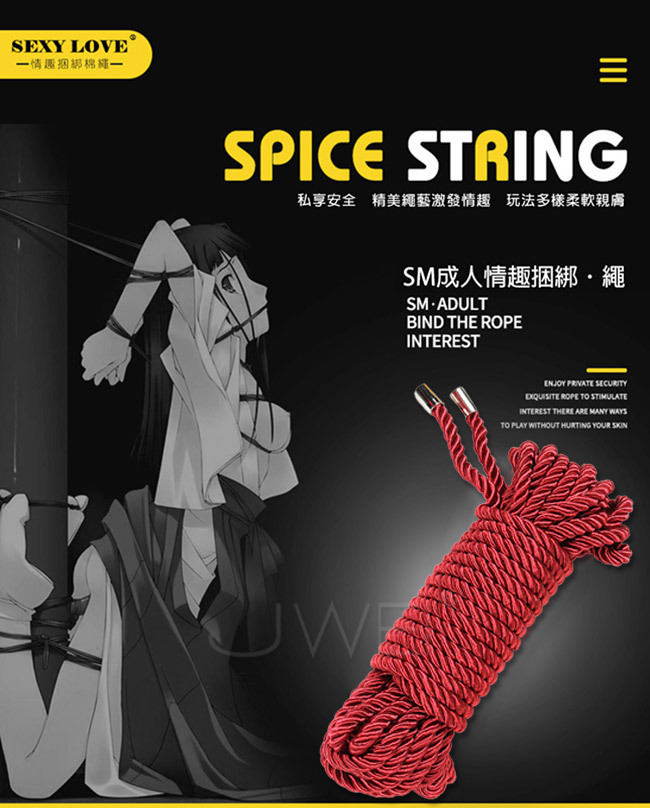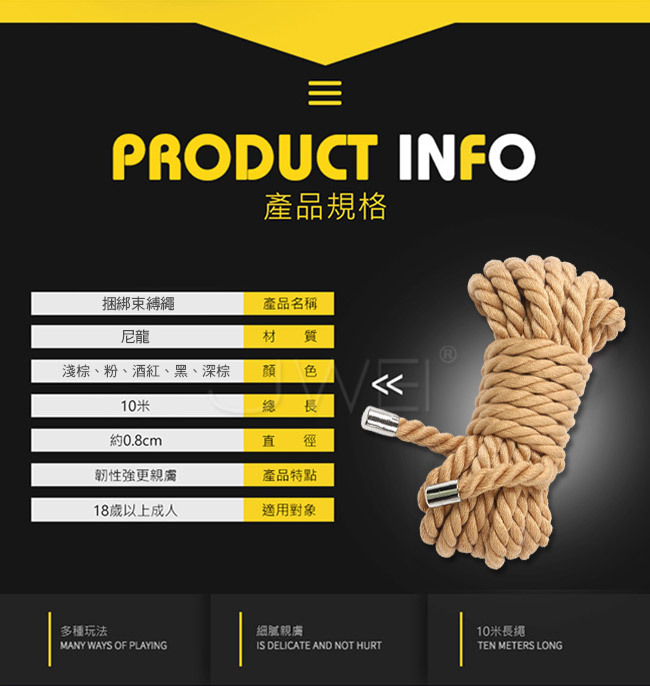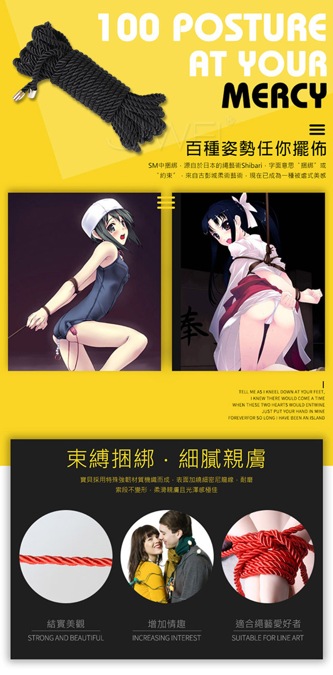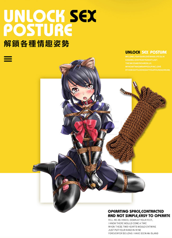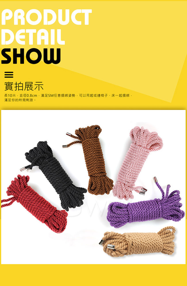 解鎖各種情趣姿勢,情趣多玩,百種姿勢任你擺佈,私享安全;束縛捆綁,細膩親膚,採用特殊強韌材質編織而成,表面加繞細密尼龍線、耐磨索段不變形,柔滑親膚且光澤感極佳!
