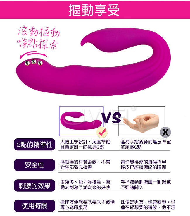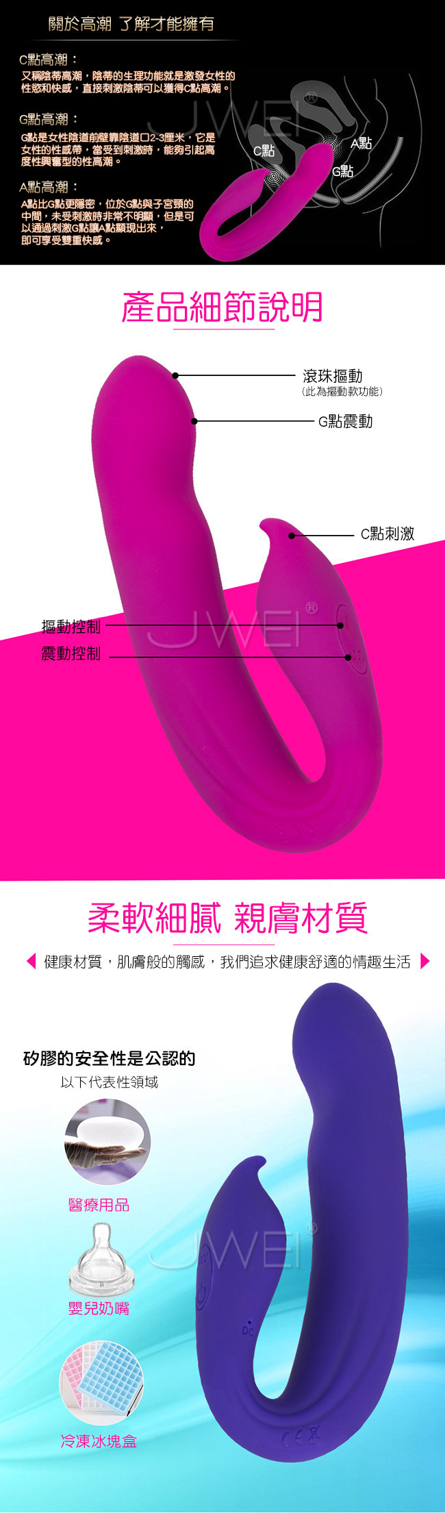 一款會雙點刺激的按摩棒,內攻G點外攻蜜豆讓滿足感從這兒出發~擁有10段頻率雙馬達震動讓酥麻快感層層襲來,欲望遍及全身每寸神經。而棒身螺紋設計結合摳動,採用全新齒輪高頻G點摳動滾珠輕鬆體驗更強高潮快感。此款為人體工學設計,緊貼私處,高潮加倍刺激喔~可任意角度彎曲同時滿足不同體位的刺激!!