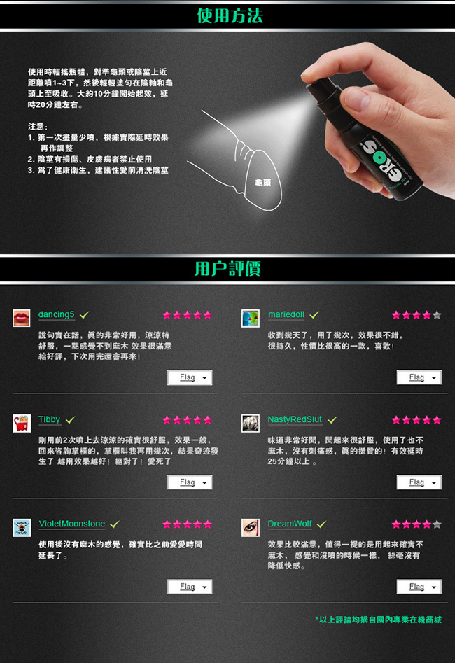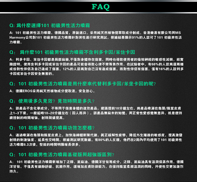 101初級男性活力噴霧,通過減緩陰莖的敏感程度,來增加陰莖勃起的時間,同時增強 了交歡的愉悅感。有效延長性交時間,增強性高潮和密集快感。水溶性基底,對皮膚 具有滋養潤滑作用。產品通過皮膚耐受性試驗和黏膜的相容性,以及通過歐盟CE,讓您更 加放心的使用。