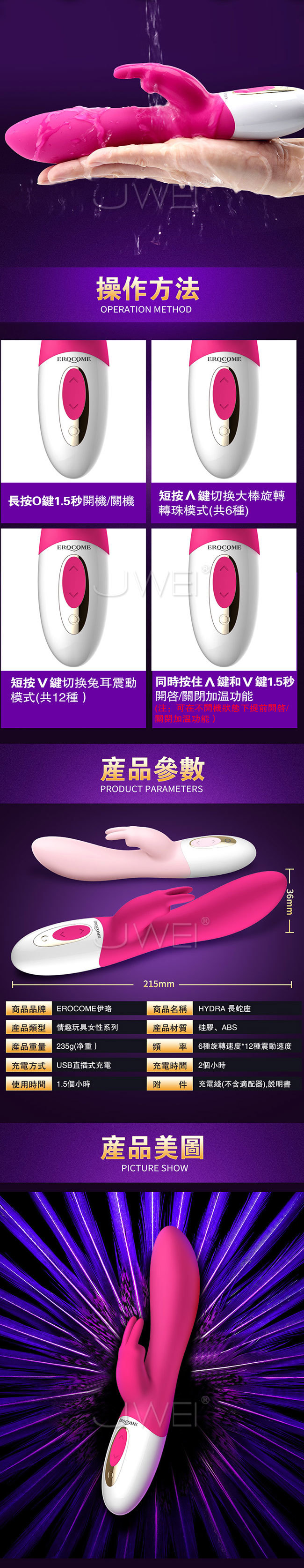 EROCOME伊珞.長蛇座Hydra 6x12段旋轉變頻雙震加溫360°轉珠按摩棒-玫紅色