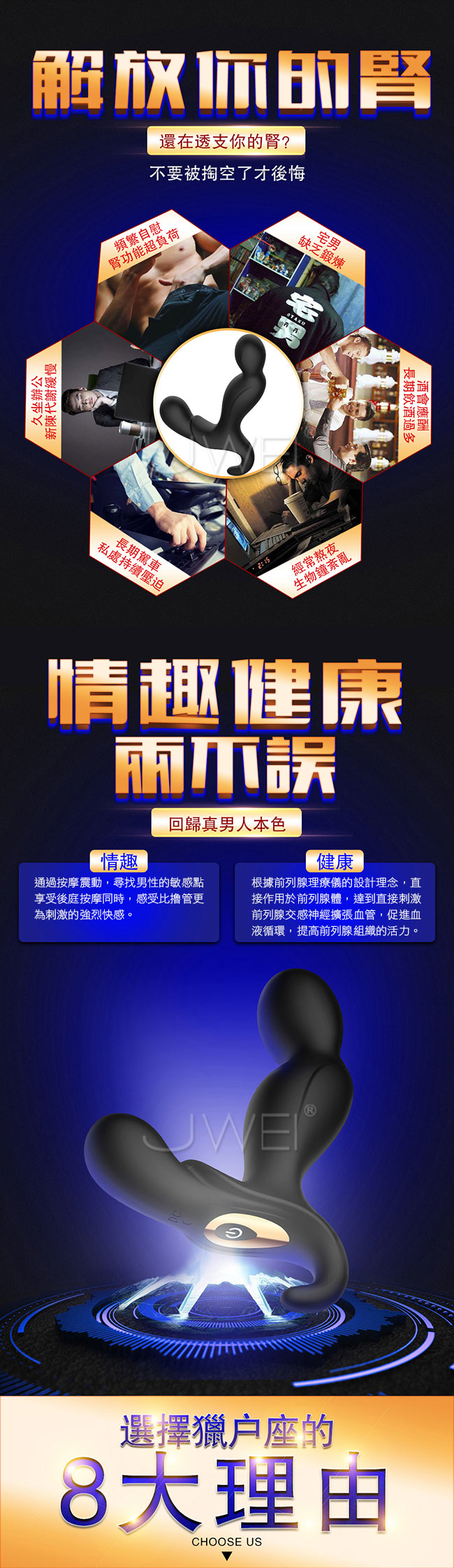 獵戶座前列腺按摩器內外同步刺激會陰及前列腺,給您雙重快感讓您潮起潮落超過癮。符合亞洲男性人體工學設計,可輕鬆滑入後庭帶來高潮體驗。擁有12段變頻多重快感隨意切換快慢隨心調節,總一款適合您的。採用安全健康矽膠,柔軟不變形讓您安心使用。此款為USB充電快速便捷,讓您縱享激情時刻,還擁有防水靜音功能讓您盡情享受魚水之歡。