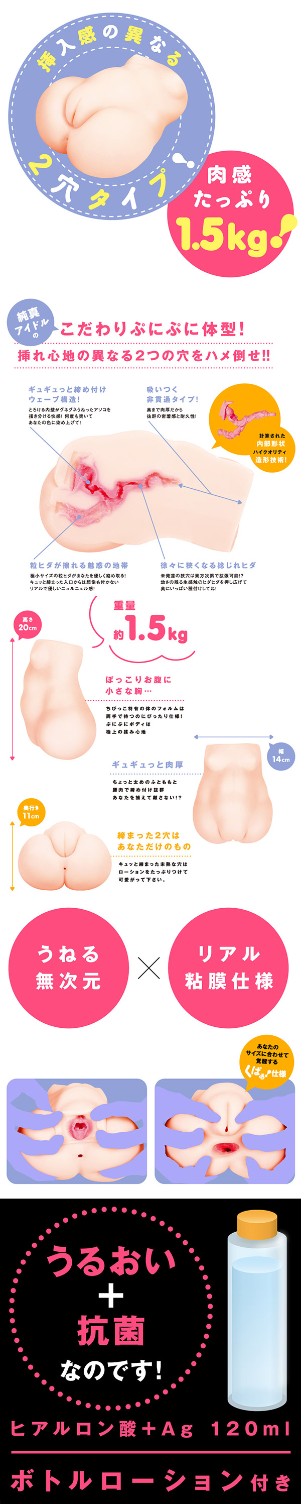 純真アイドルをイメージした、こだわりのぷにぷにボディを再現した2穴タイプオナホール「ち○っこアイドル さくら」。 ぷっくりとした可愛らしいアソコを開くと中はリアルなピンク色で、粘膜コーティング仕様の内壁が本物以上のヌメヌメ感を実現。 挿入すると、ヴァギナ側はとろけるような感触のうねる内壁が締め付けとともに刺激し、アナル側は極小サイズの無数の粒ヒダがあなたを優しく擦り上げて、絶頂へと導きます。 リアルで優しい魅惑の挿れ心地を、ぜひ体感してみて下さい。