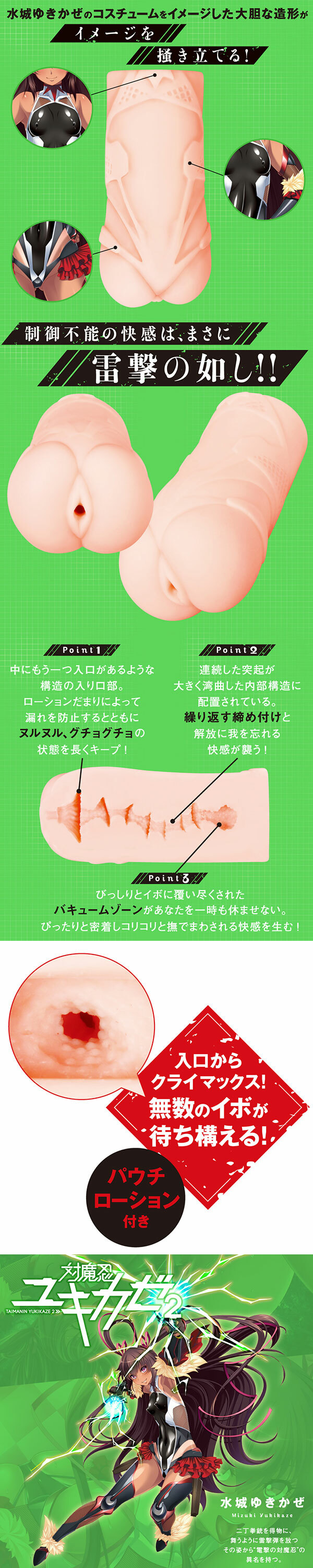 人気PCゲーム「対魔忍ユキカゼ」のオナホールが登場!ホール本体のデザインはユキカゼのイメージを忠実に再現した仕様となっております。連続した突起が大きく湾曲した内部構造に配置されています。びっしりとイボに覆い尽くされたバキュームゾーンがあなたを一時も休ませません!15mlパウチローション付属