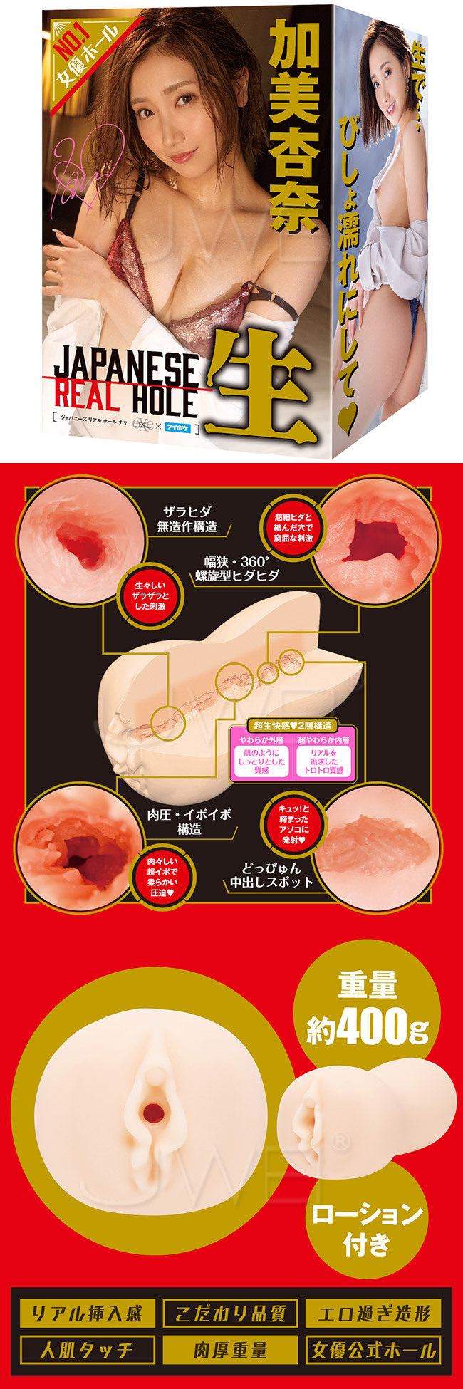 NO. 1AV女優自慰套!!超純粹快感!雙層結構『JAPANESE REAL HOLE 生』漂亮好色又喜歡做愛_超級正的女孩!!盡情享受純粹深入加美杏奈的極上名器!!到枯竭為止被加美杏奈榨乾吧!!人體肌膚感「逼真的插入感・超色情的造型」確實感到插入感「肉厚重量」的堅持品質,和永遠只屬於您的加美杏奈享受真實又稠密的極上PLAY。內附潤滑油 審查編號:2300102