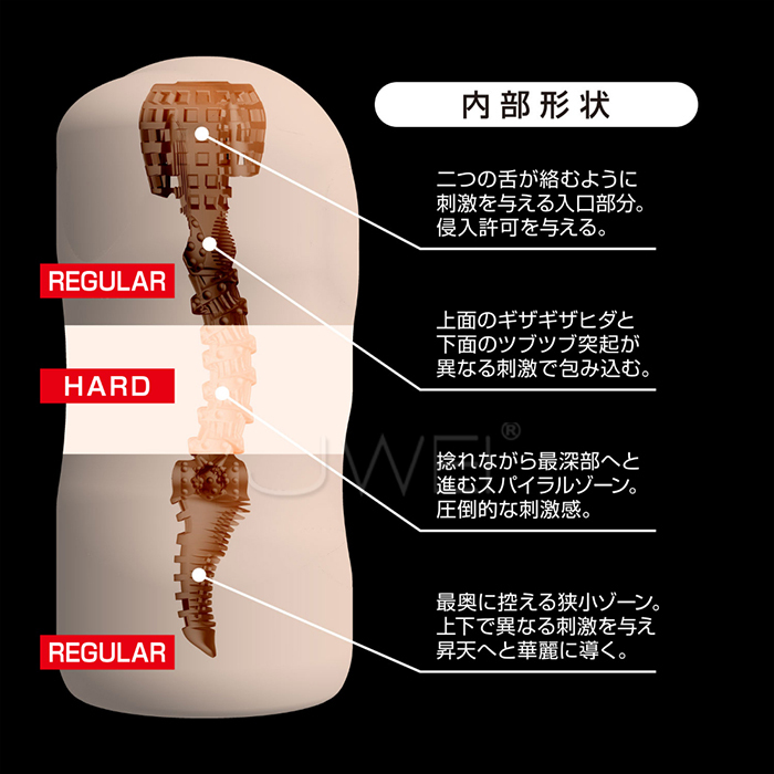 この堕悦は硬度の異なる二つの素材を三層に配置し、柔・硬・柔の挿入感を実現しました。 絹の様な柔らかい感触と、しっかりと刺激を与えるハードな感触が交互に訪れます。 また内部構造は二つの舌が絡みつく入り口部分。 上下で異なる感触面を通過し、捻れるヒダを通過する中間部。 狭小の壁面でしっかりと包み込む最奥部。 これらは快感を高めるために考えられた構造になっています。