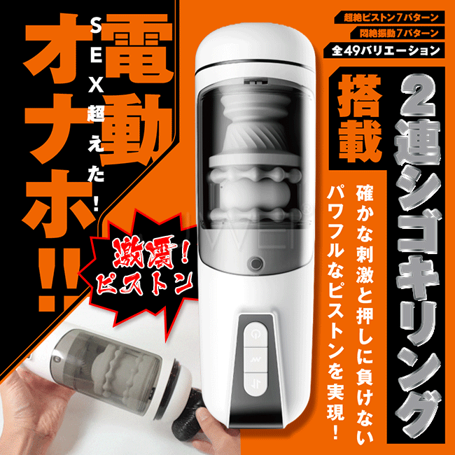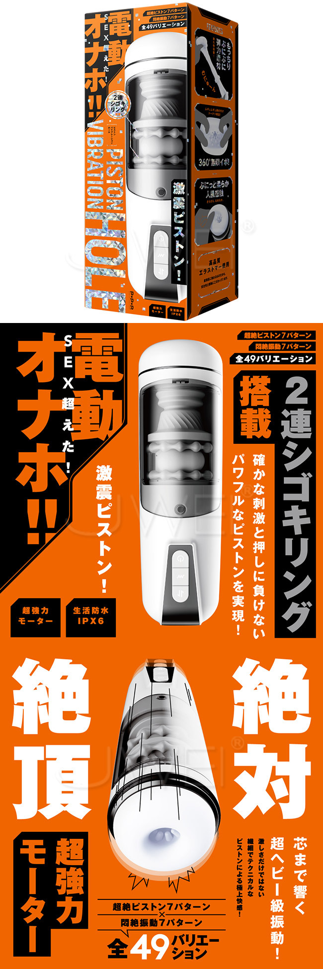 ふるえるピストン!電動オナホ!絶対絶頂!超絶ピストン 7パターン×悶絶振動7パターンの全49バリエーション!2連シゴキリング搭載で、確かな刺激と押しに負けないパワフルなピストンを実現!激しさだけではない繊細でテクニカルなピストンによる極上快感!超強力モーター搭載による、芯まで響く超ヘビー級振動!初心者にも使いやすい電動ホールです。3つのボタンでシンプル操作!ホールを取って洗うだけなので後処理簡単!重量約817gで手持ち操作も楽々!充電式なので電池交換不要!もっちりぷにぷに弾力素材のインナーホールは耐久性抜群!360°無限イボ!ムギュムギュ締め付けドーナツ構造!さらさら、なめらか。ぷにっと柔らか人肌感触をお楽しみください!生活防水 IPX6。※本体は絶対に水洗いしないでください。 ホールのみ水洗い可能です。検査番号:2300436