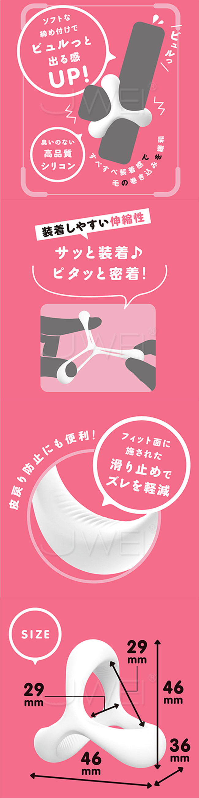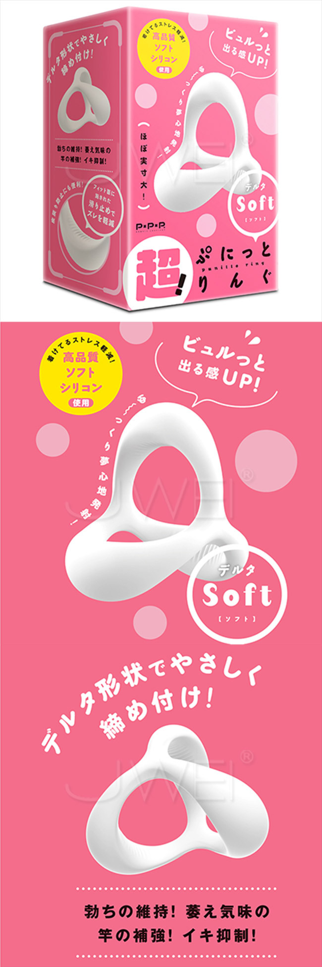 《超!ぷにっとりんぐ デルタ ソフト 》 超!ぷにっとりんぐからサッと装着ピタッと密着!根元を3点締めしてくれるデルタ ソフトverが登場。臭いのない高品質ソフトシリコンで着けてるストレスを軽減!デルタ形状でやさしく締め付け!勃ちの維持!萎え気味の竿の補強!イキ抑制!フィット面に施された滑り止めがズレを軽減し、皮戻り防止にも便利です。ビュルっと出る感UPでゆ~っくり夢心地発射!検査番号:2100465