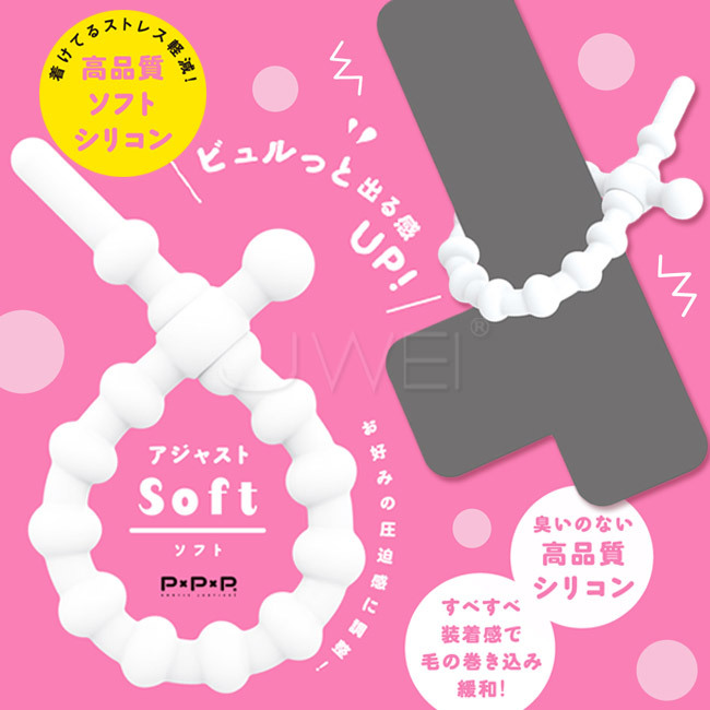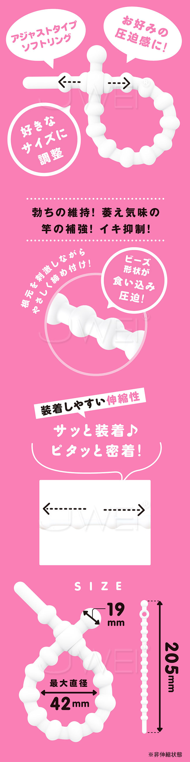 《超!ぷにっとりんぐ アジャスト ソフト》 超!ぷにっとりんぐからサイズの調整が出来るアジャストタイプが登場。ストッパーの凹凸も心地よい刺激となって楽しめます!自分のサイズに合わせて、自分好みの締め付けで、サッと装着ピタッと密着!ソフトverは臭いのない高品質ソフトシリコンでやさしく締め付け!勃ちの維持!萎え気味の竿の補強!イキ抑制!自分サイズに合わせられるので皮戻り防止にも便利です。ビュルっと出る感UPでゆ~っくり夢心地発射!検査番号:2202030