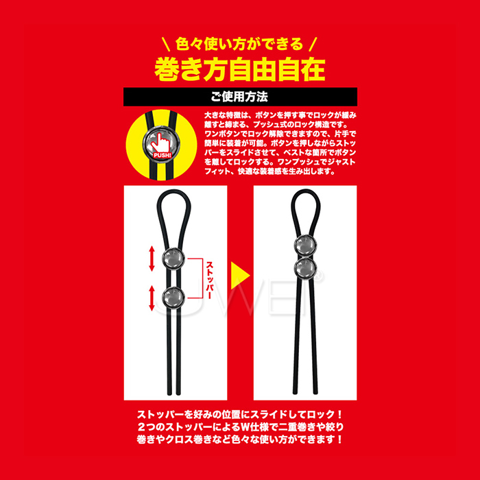 ササッと締めやすく、ガチリと緩みにくい、快適な使用感を実現しました。さらに、ストッパー2個付いていますので、二重巻きやダブル巻きなど色々使い方ができる多機能仕様。