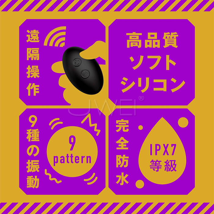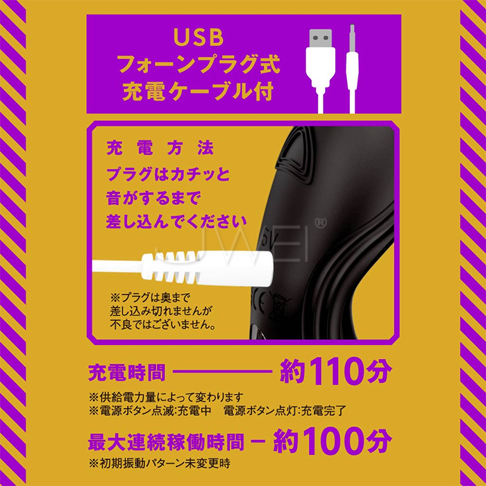 本体は充電式なのでエコに使用可能。※本体:充電時間約110分※本体:最大連続稼働時間約100分(初期振動パターン未変更時)_IPX7等級_9パターン振動_付属品:電池式リモコン_USBフォーンプラグ式充電コード