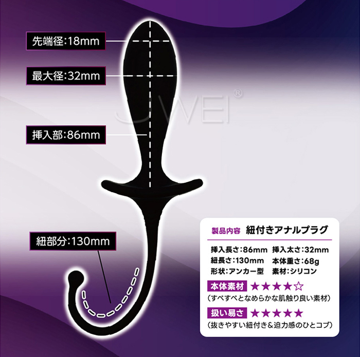 アイデアナル商品になるかもな紐付きアナルプラグで、挿入部は長めの挿入長に丸みのある先端は挿入時にアナル口へインパクトをもたらし、3.2cmの程よい太さでグッと押し広げられる感覚も楽しめる!