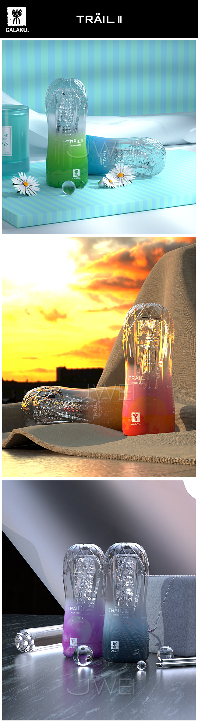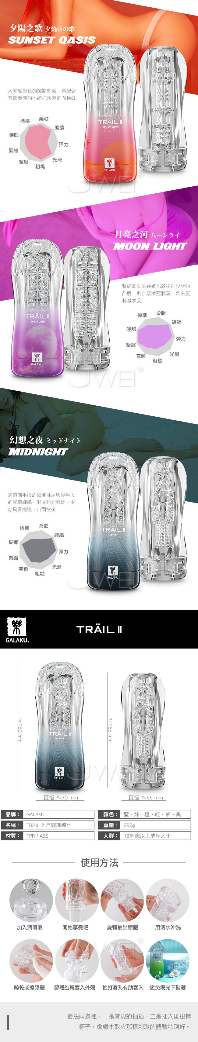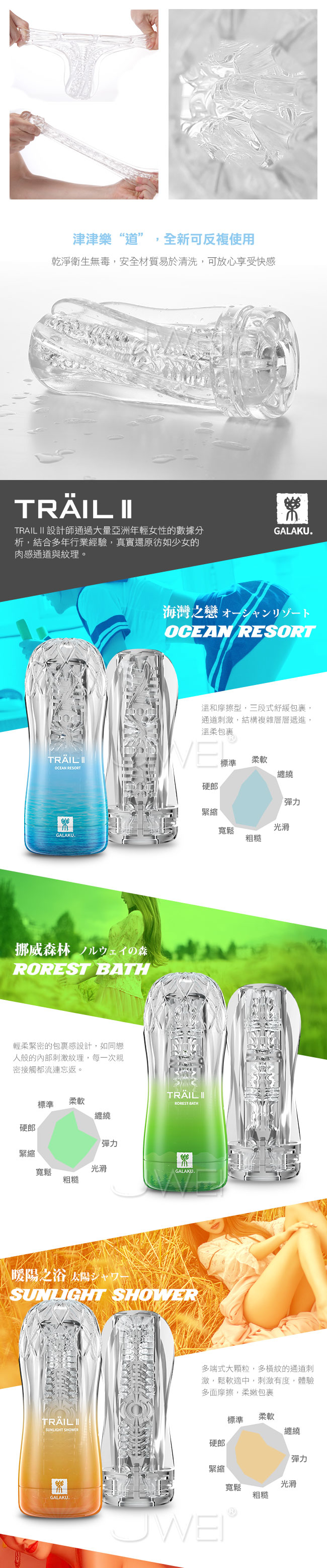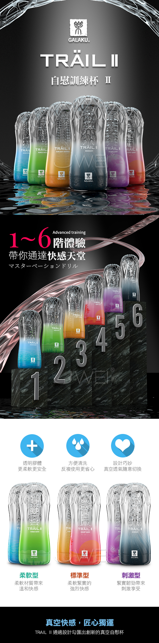 TRAIL II 自慰訓練器體驗1~6階帶您通往快感天堂的飛機杯,全採用透明膠體更柔軟更安全,並且可重覆使用方便清洗!採真空吸吮真實還原如少女般的肉感通道與紋理其中海洋之戀、挪威森林為柔軟型,柔軟的材質代給您溫和快感;暖陽之浴與夕陽之歌為標準型柔軟緊實的感覺帶來強烈快感;而月亮之河和幻想之夜為刺激型緊實韌勁的設計帶給您更刺激的享受。6款獨特設計的通道讓您因為比真實更刺激帶來昇仙快感喔~