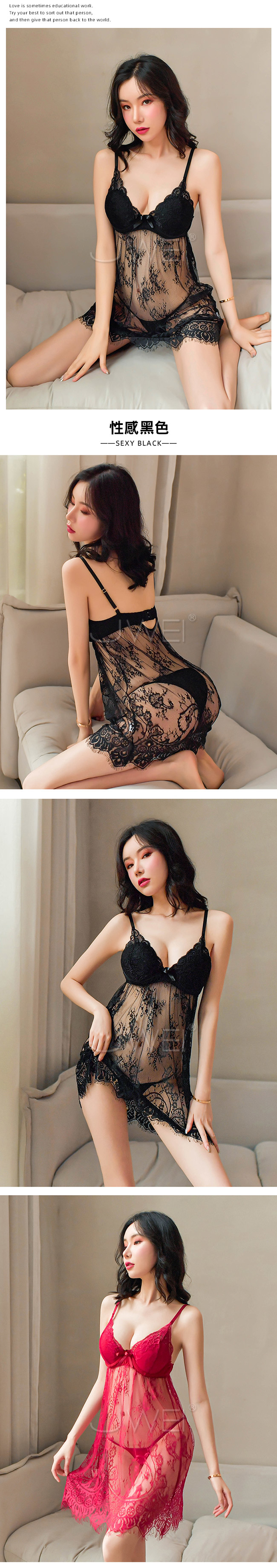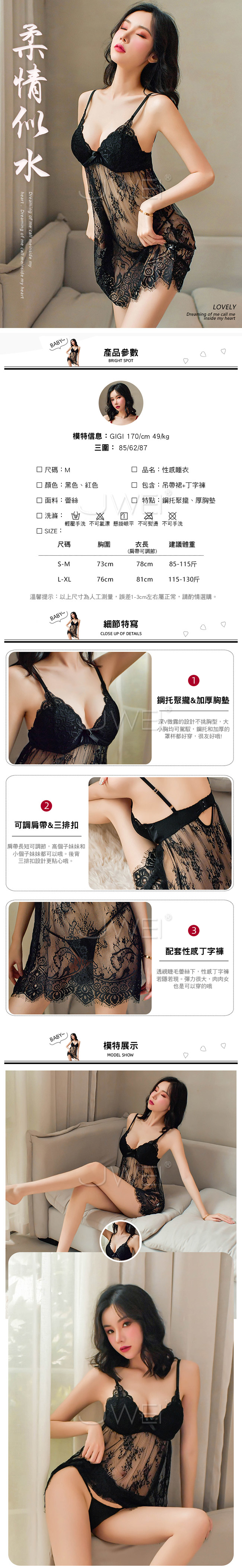 柔情似水.鋼托聚攏性感蕾絲吊帶睡裙(黑色)
