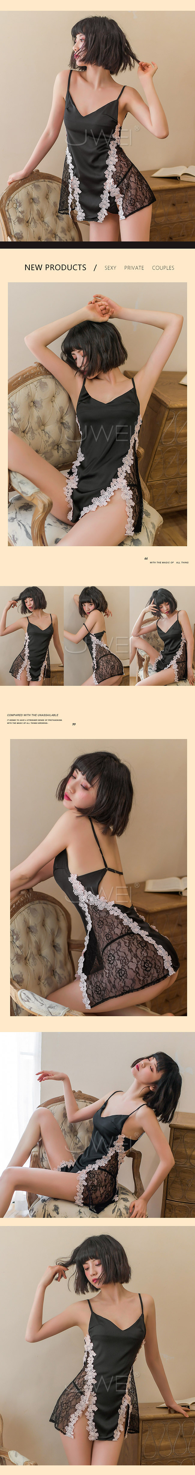 醉人之夜.側開衩蕾絲花邊誘惑吊帶睡衣(黑色)