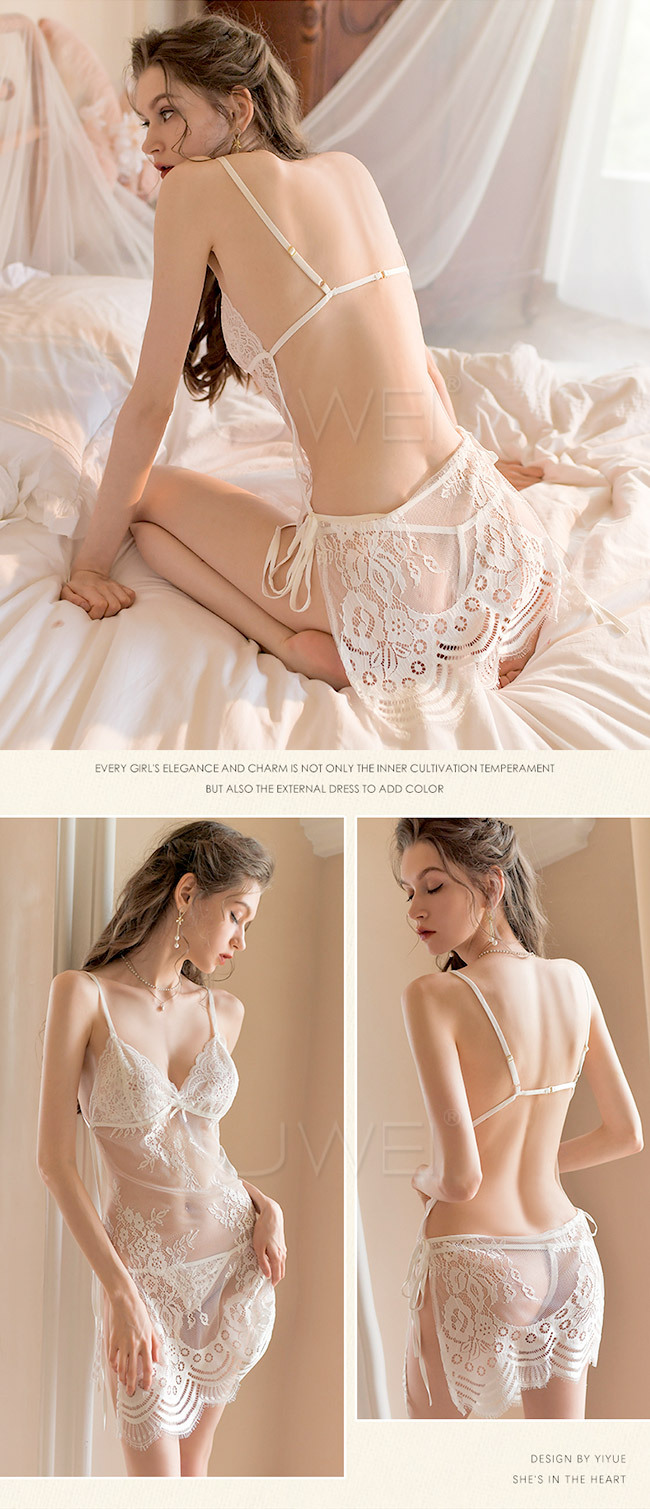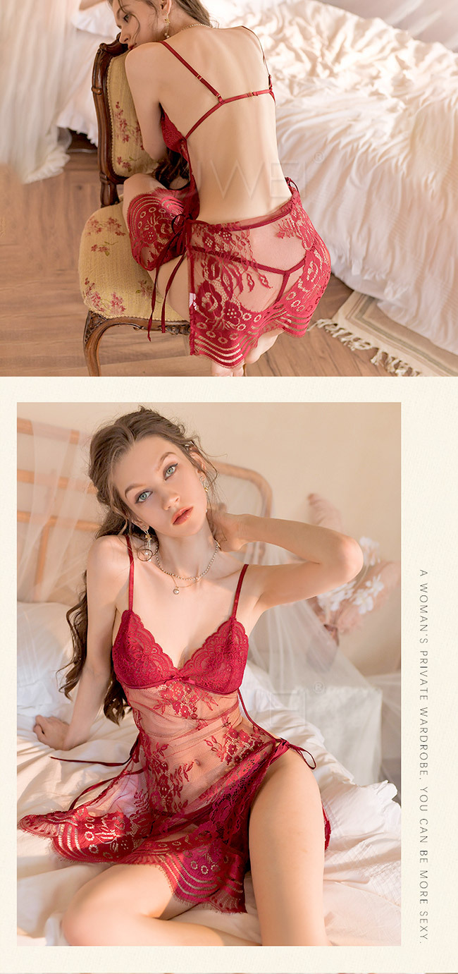 日漸沉淪.透視吊帶繫帶蕾絲睡裙(酒紅色)