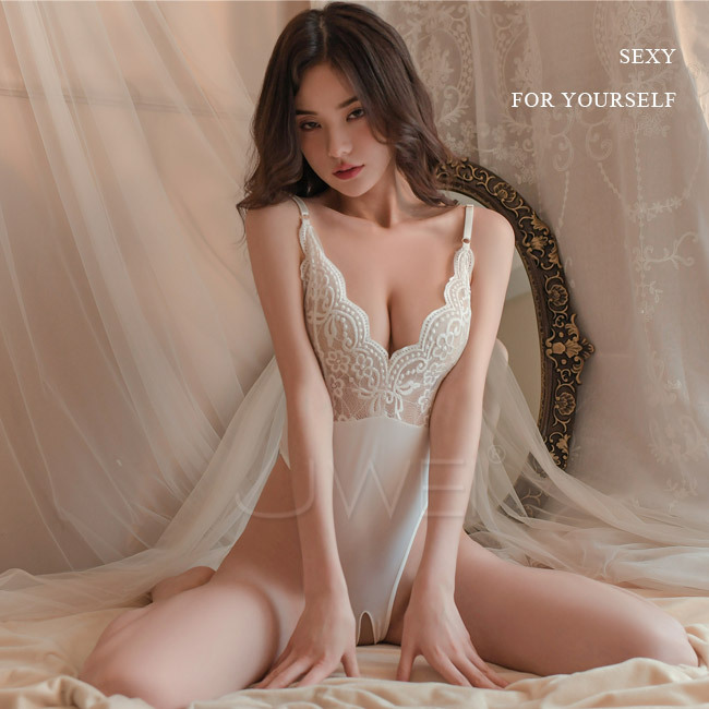 暗慾尤物.性感蕾絲深V顯溝露背開檔連體衣(白色)