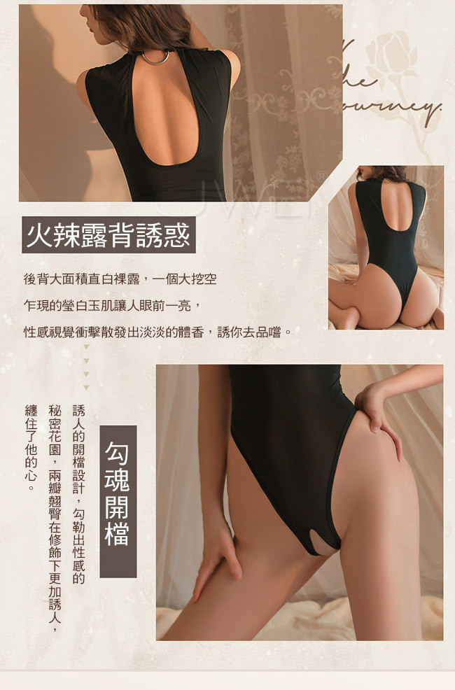 瞹昧觸動.性感鏤空顯胸溝露背開檔連體衣(黑色)